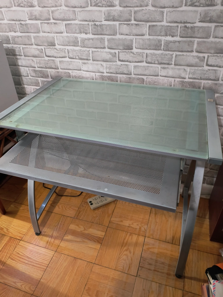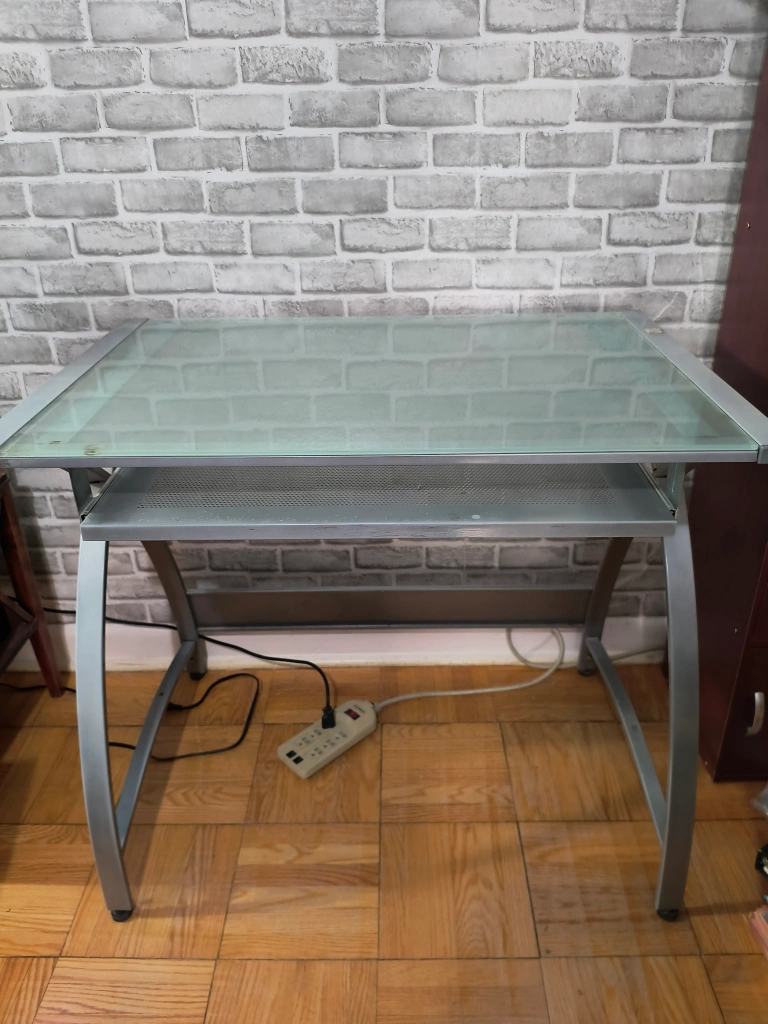 Small glass computer desk with pullout keyboard drawer.