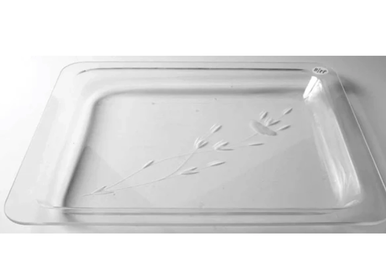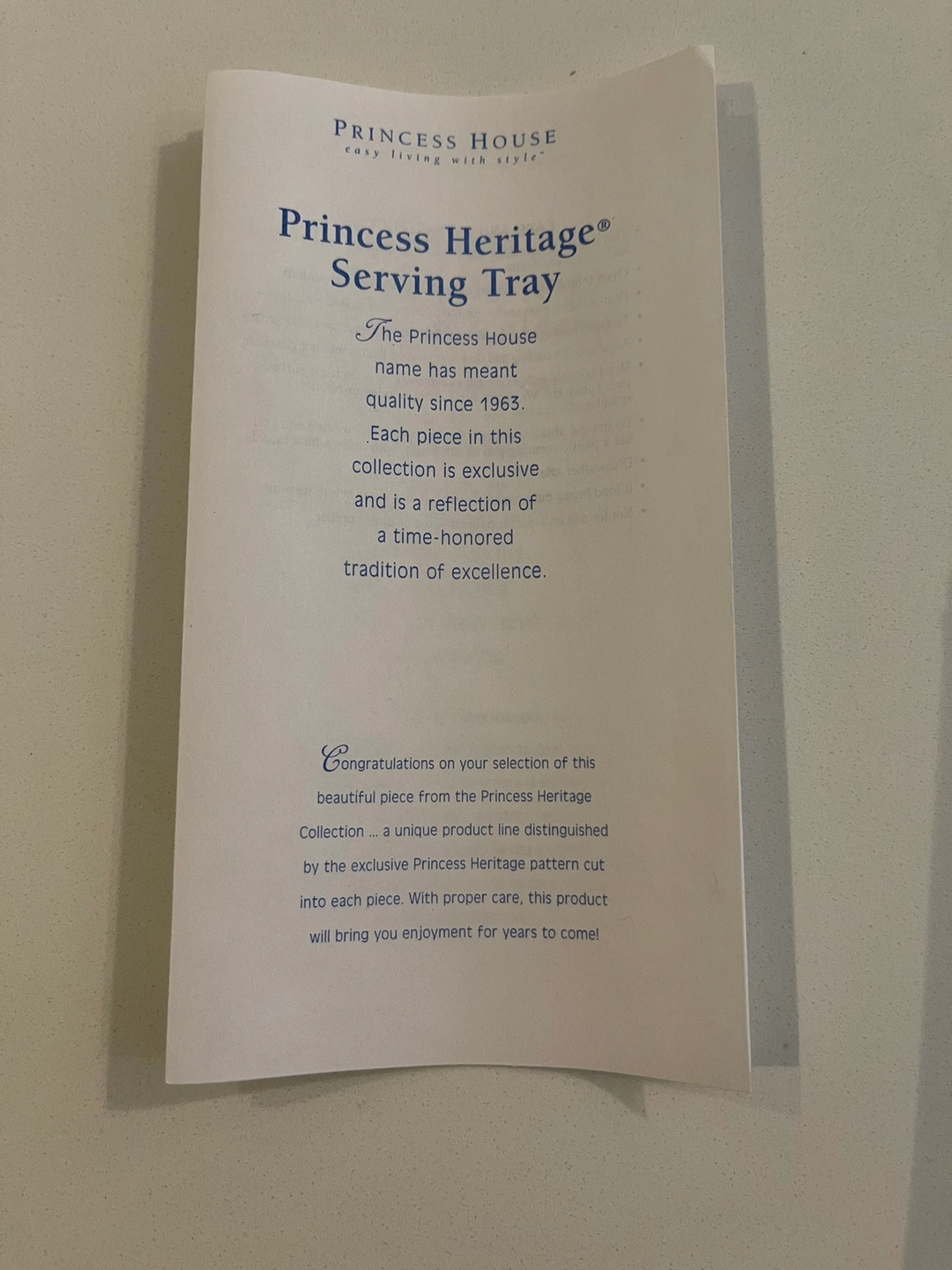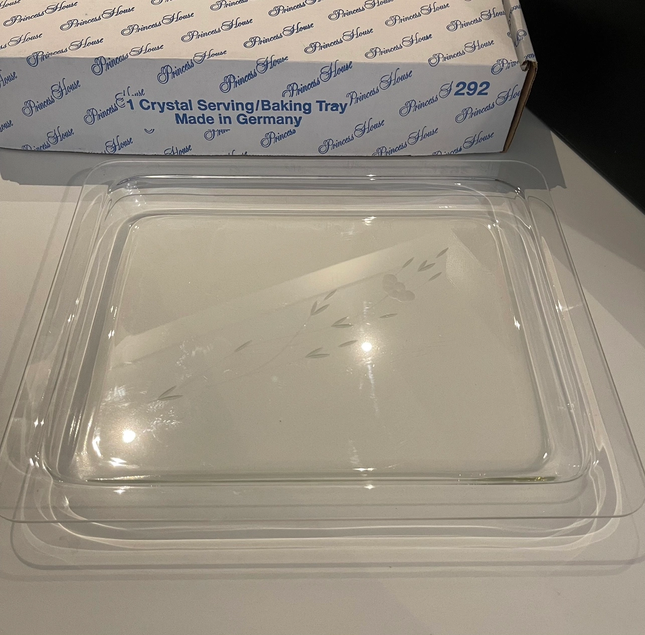 Princess House “Heritage” Crystal Serving / Baking Tray with Delicate flower and leaves etching. Beautiful for a party or for everyday use. Clear crystal compliments any decor. In box, used condition 2 slight scratches, but no chips . Warm and serve items in the same tray . Can be used in microwave and conventional ovens at low heat instructions included.