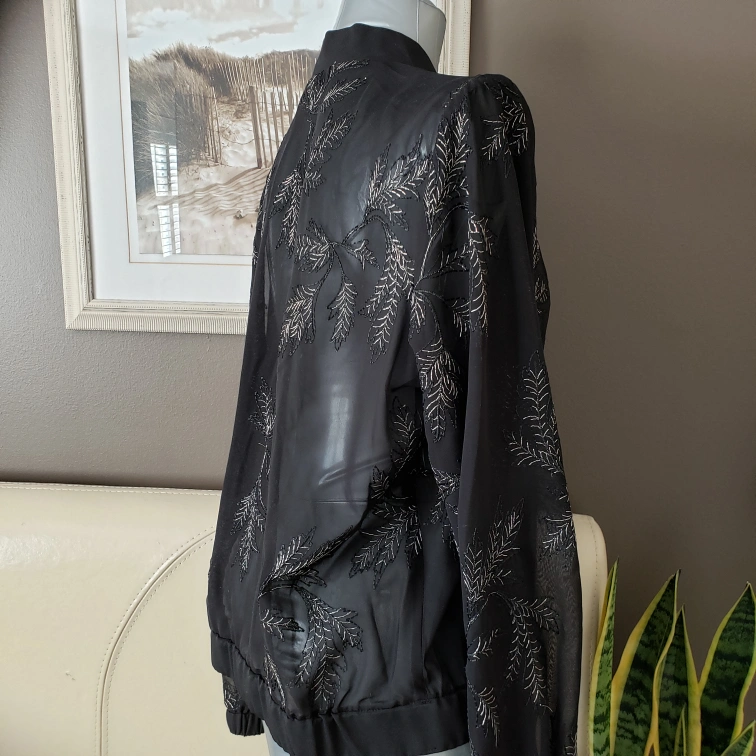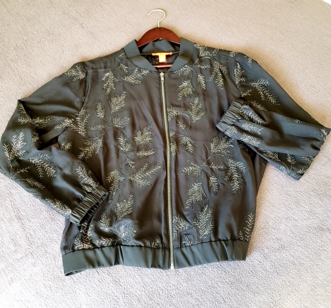 Fully zips up or wear open. Features silver and black embroidery. Elastic at cuffs and waist.
