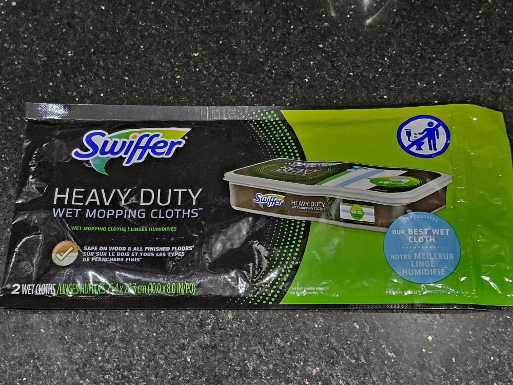 Swiffer heavy duty wet mopping cloths. Brand new and never used. Never opened the package. Has 2 wet cloths inside. Only compatible with Swiffer floor mop.