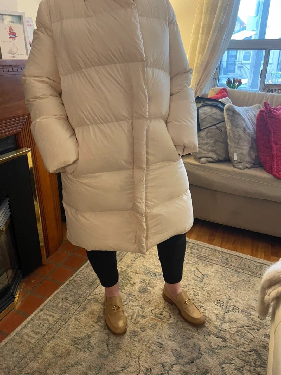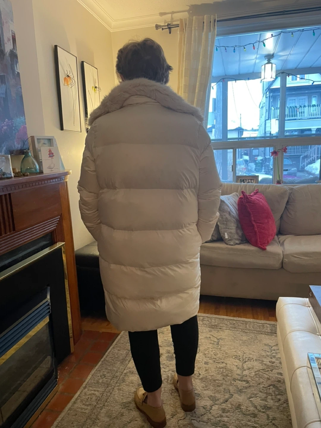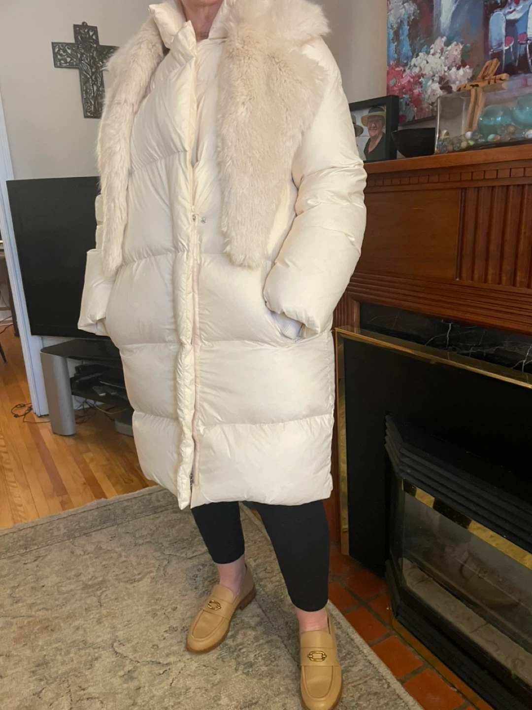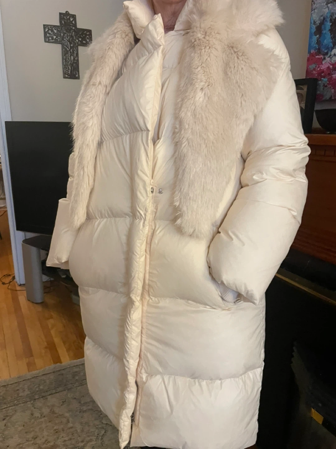 Cream coloured long puffer coat. Features a removable faux fur collar and a zip-up front. Pockets on the sides. It's a stylish and warm outerwear option. So warm and elegant!