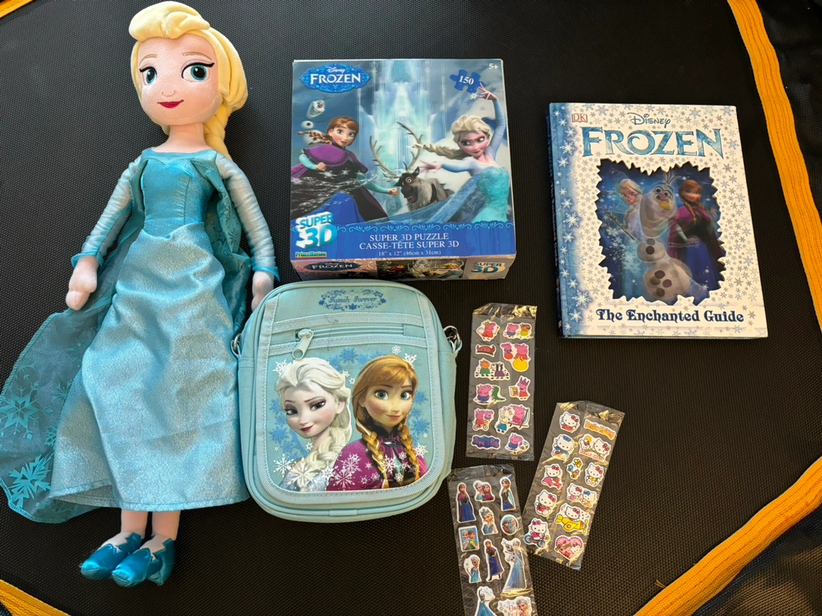 The Frozen Adventure Gift Set includes an Elsa princess doll, a small crossbody bag, an exquisite storybook, a 3D puzzle and some stickers.