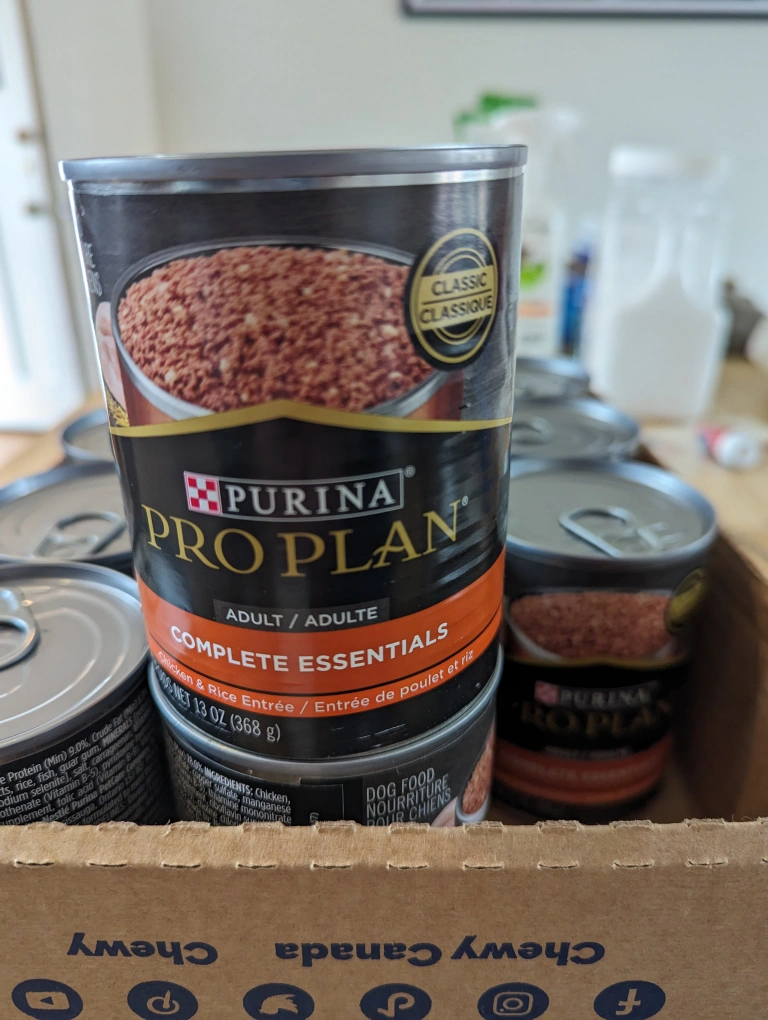12 cans of Purina Pro Plan Complete Essentials chicken and rice entree adult dog food.