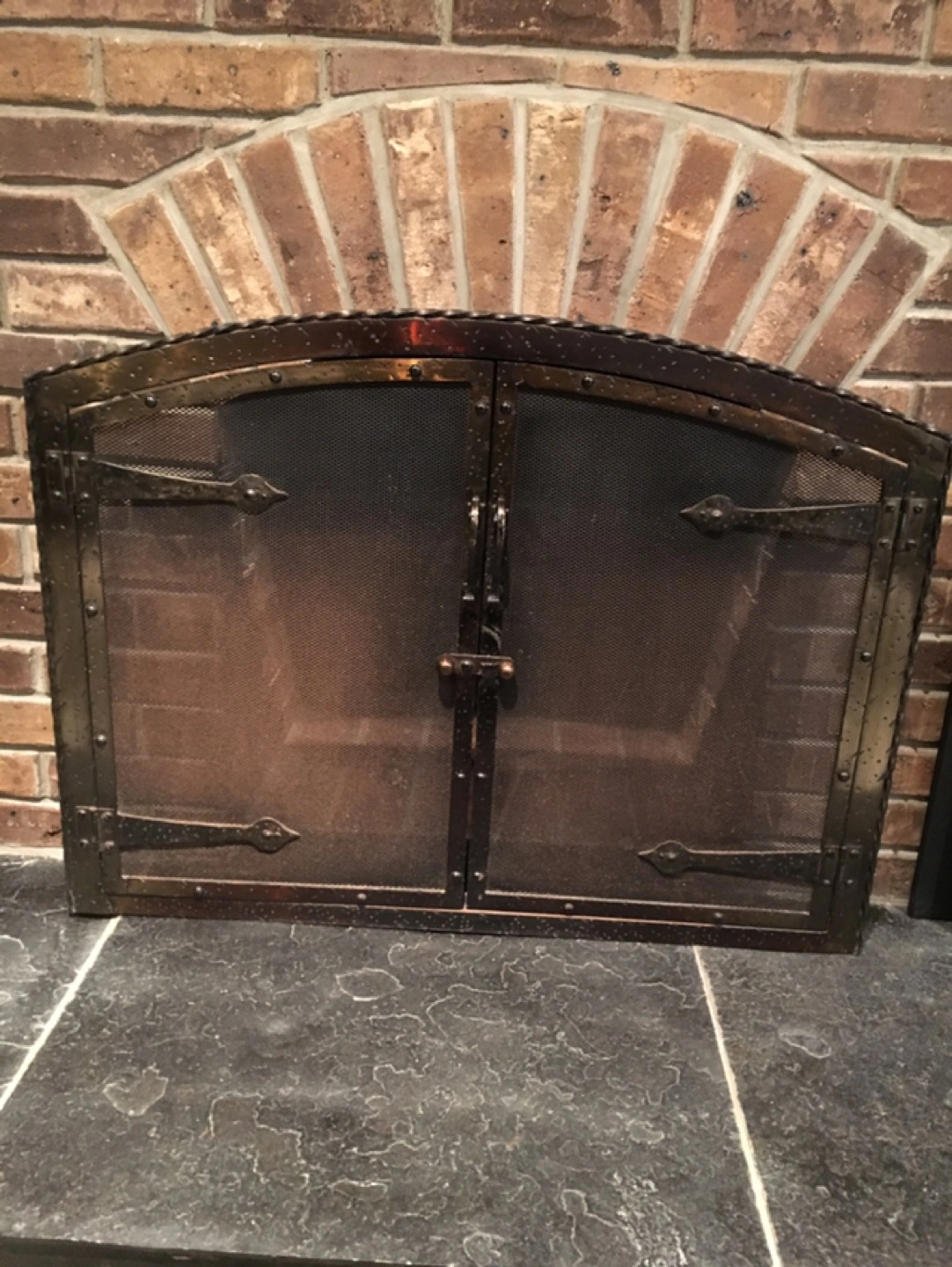 Custom Made Iron Fireplace Screen, double doors. Fits opening 22” high and 31.25”wide. Also included are the tools and wood caddy.