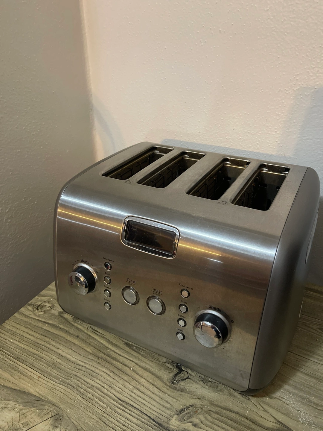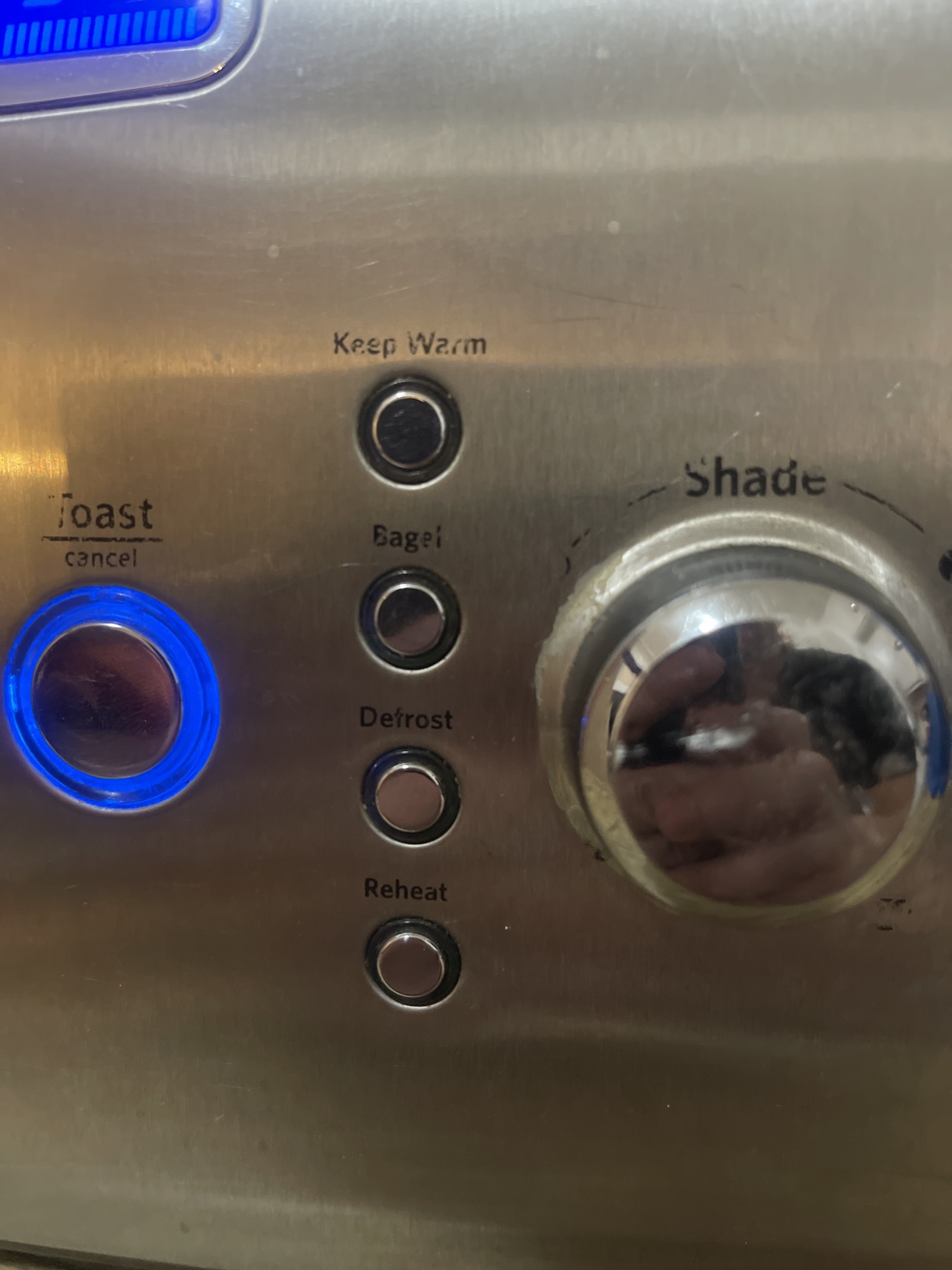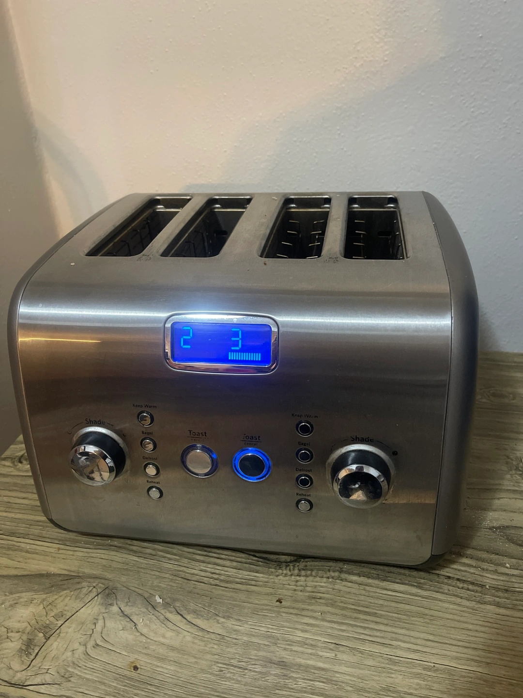 $140 brand new. You can buy it for about $40. That’s an amazing deal. Push button start and stop. The toaster beeps to let you know when the bread and bagels are done. It’s the best toaster I ever owned.