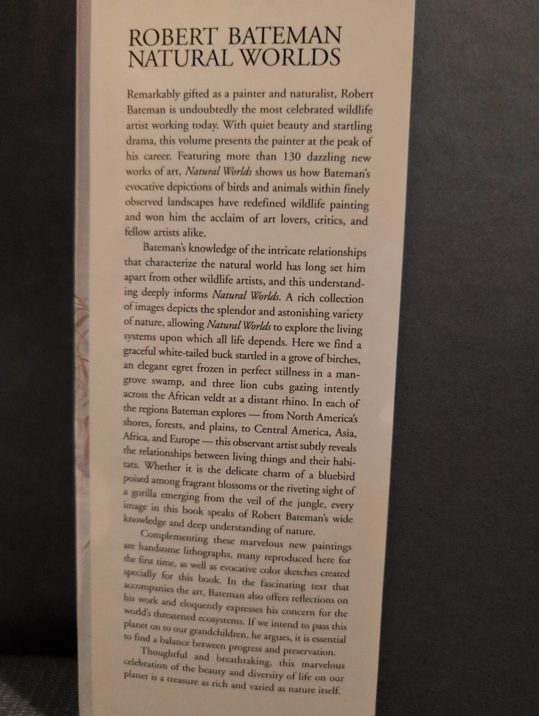 Selling a copy of Robert Bateman's 'Natural Worlds'. This book showcases Bateman's paintings of wildlife and nature. It includes text by Rick Archbold and features depictions of birds and animals in various landscapes.