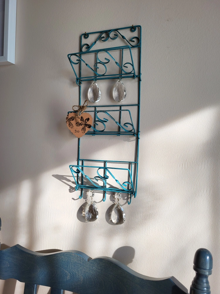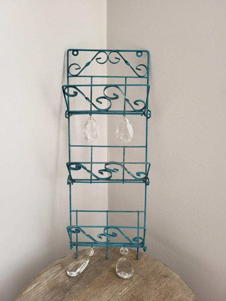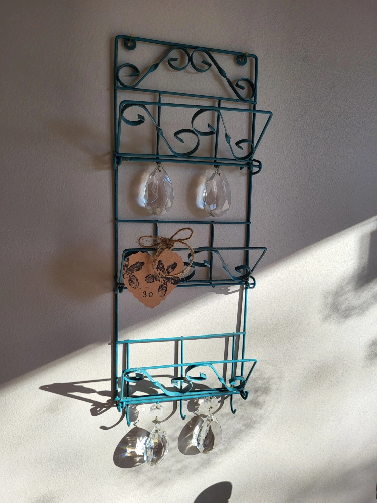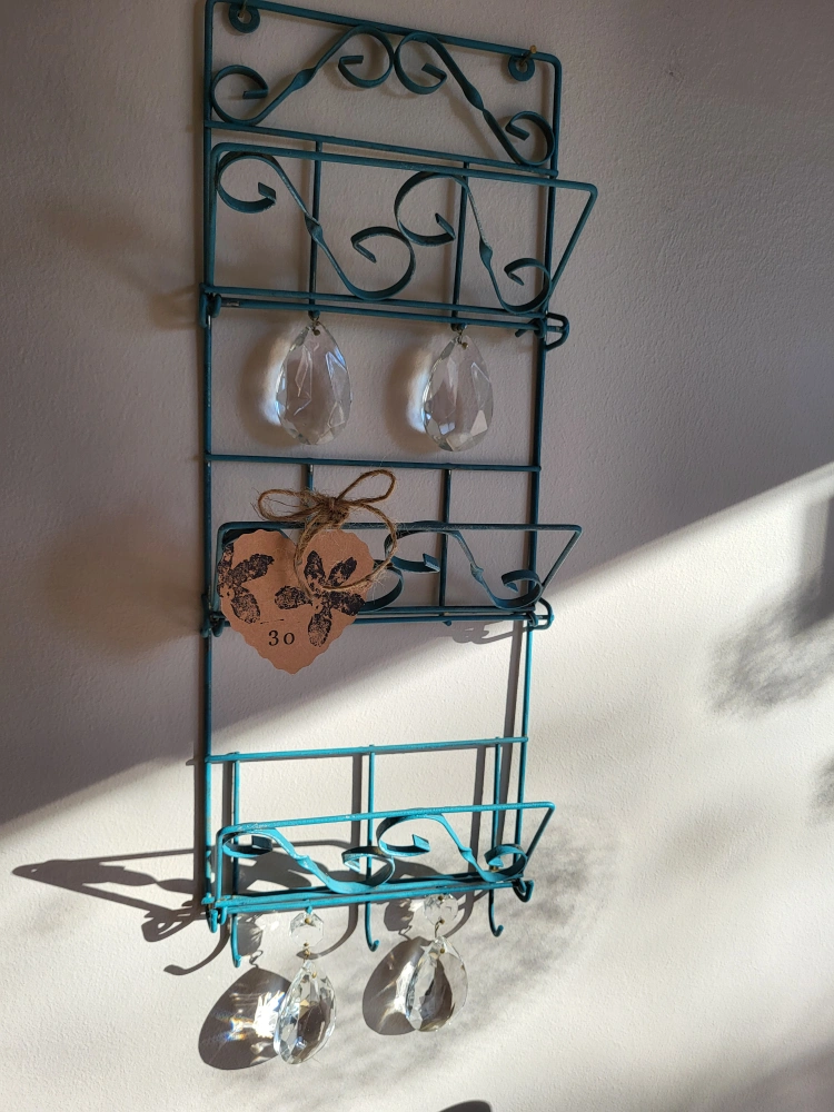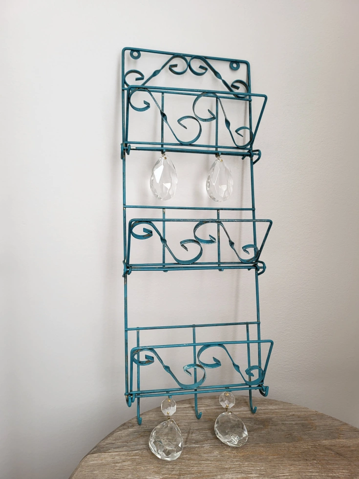 Upcycled mail holder made of metal. Painted by hand to give off that vintage charm. Sealed with clear matte acrylic and shadowed with antique brown wax. Added crystals and securely fastened. In excellent working condition. Arms do fold up and down. Hardware is not included.