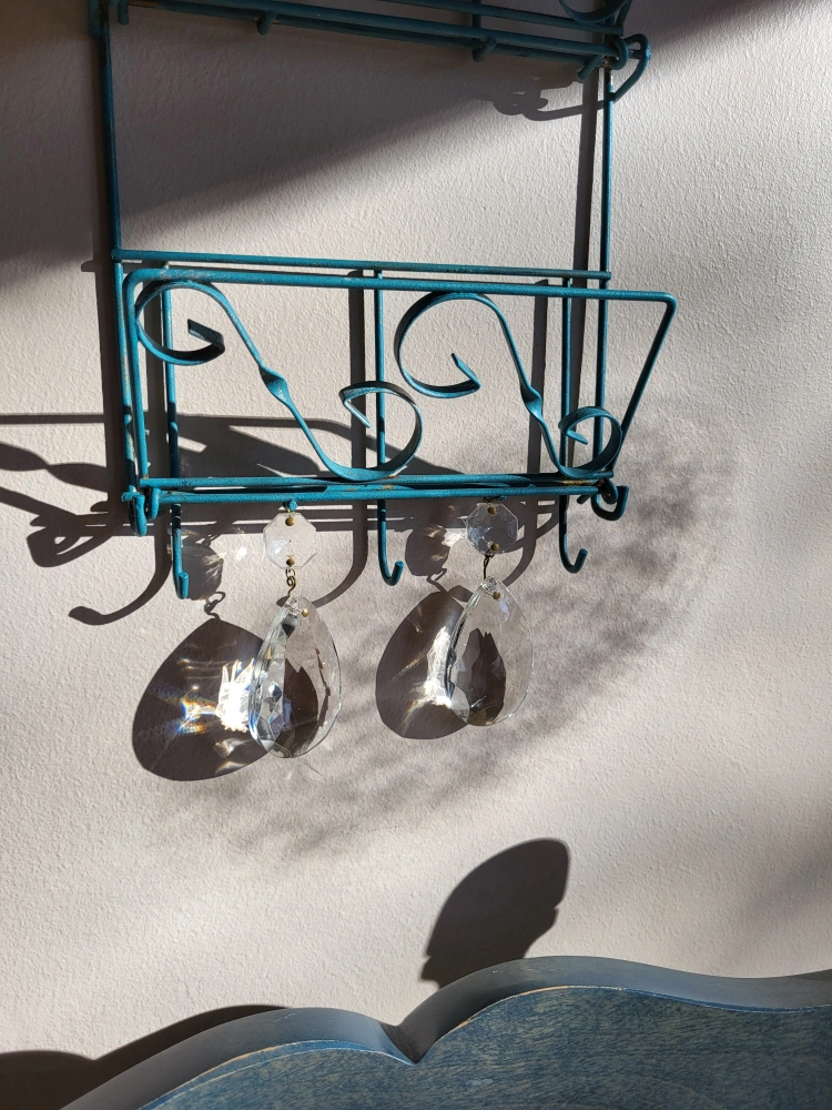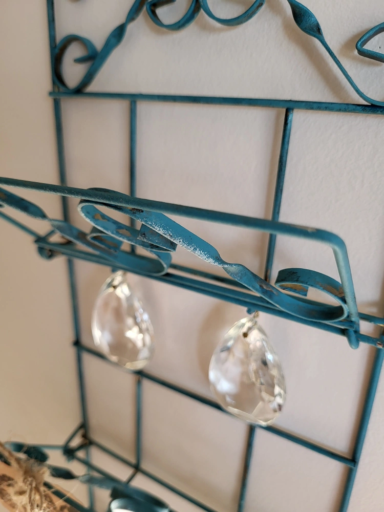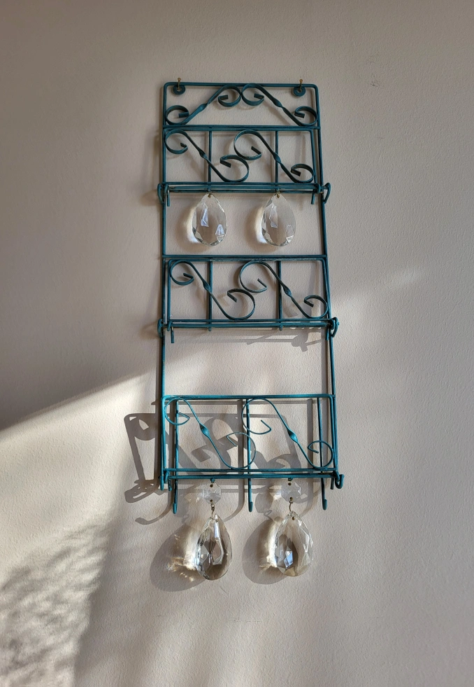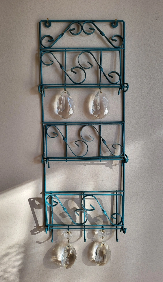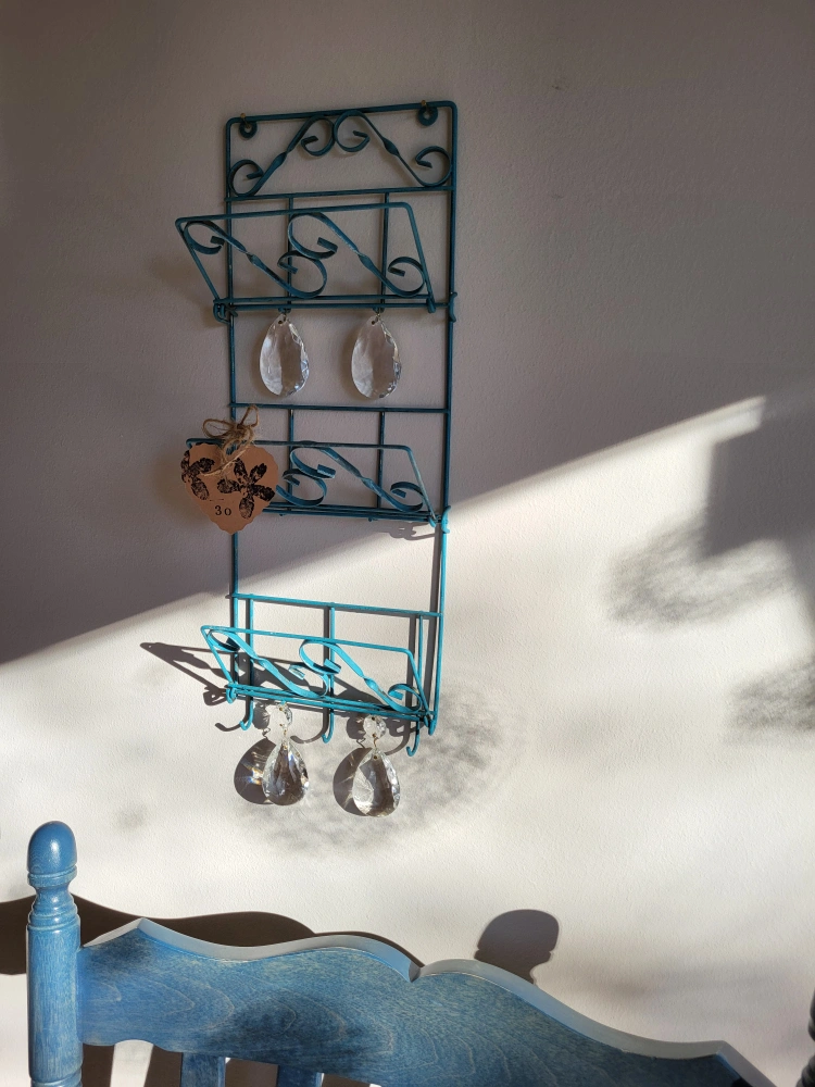 Upcycled mail holder made of metal. Painted by hand to give off that vintage charm. Sealed with clear matte acrylic and shadowed with antique brown wax. Added crystals and securely fastened. In excellent working condition. Arms do fold up and down. Hardware is not included.