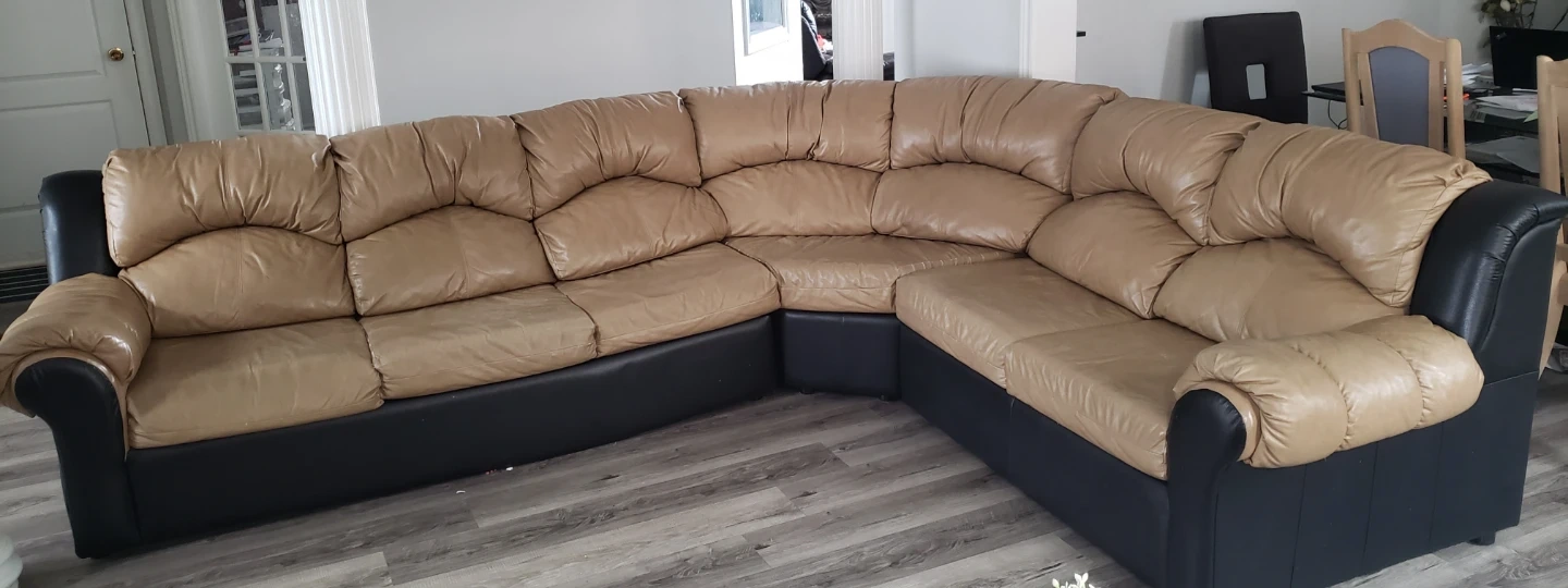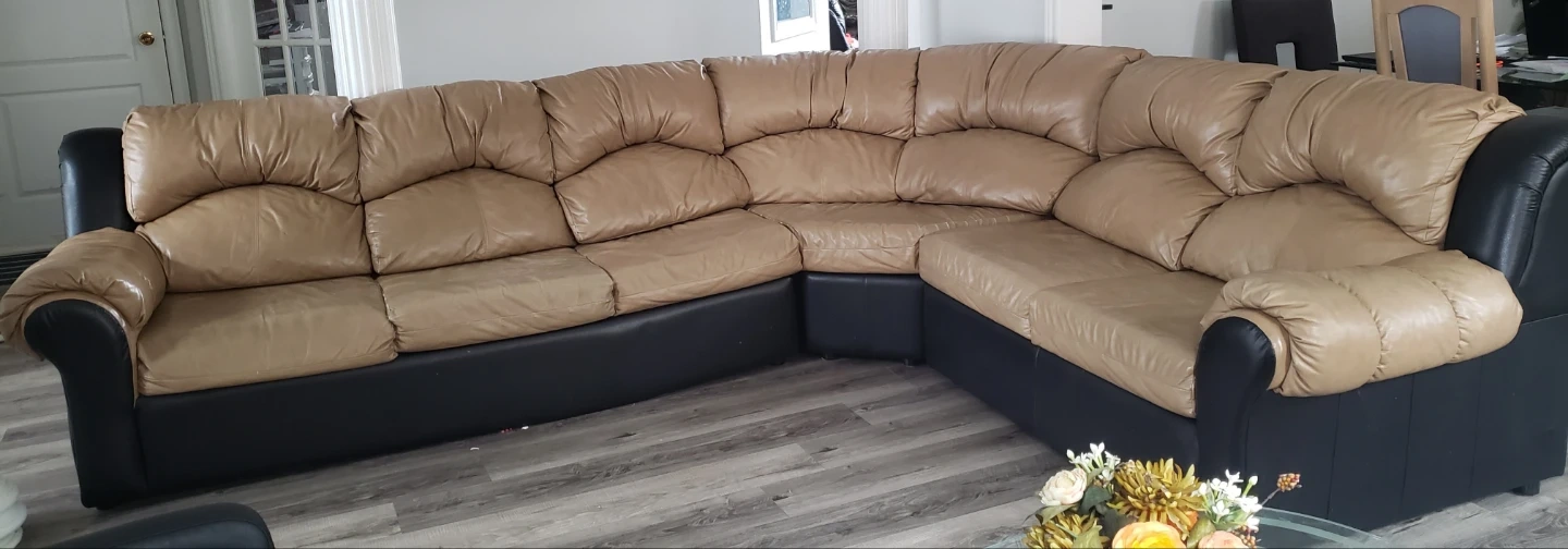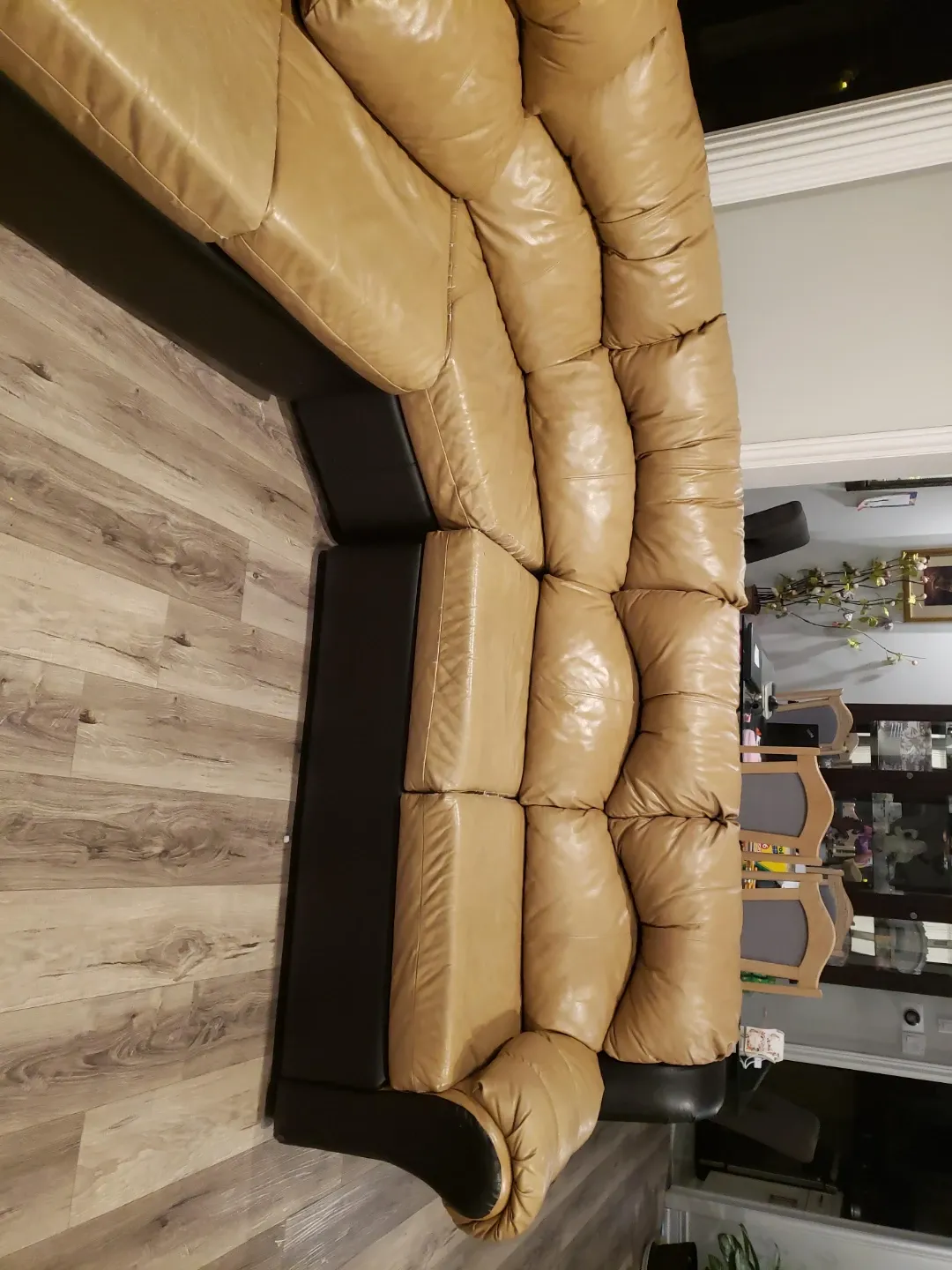 Selling a comfy sectional sofa! It features a tan leather seating area with a black leather base and backing. It's in good condition and ready for a new home!