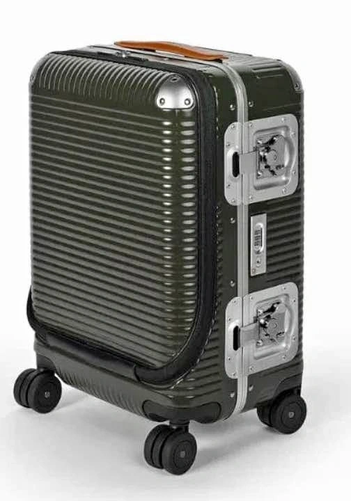 This FPM Milano Bank Light Spinner 53 suitcase is moss green and has never been used. It was originally purchased for over $1400 plus taxes. Designed for every kind of journey, it offers a perfect harmony between strength and practicality. It combines the flexibility and lightness of Makrolon® polycarbonate with luxurious leather details. The robust corners and anodized aluminum hinges add strength and security. The elegant Butterfly Lock completes the exclusive design. Features include a Makrolon® polycarbonate shell, soft Italian leather top handle, non-slip rubber service handle, adjustable telescoping handle, integrated TSA lock, two maxi butterfly locks, fabric tie-down straps with clips, two elastic bands with nickel clips in both shells, and an inside pocket with zipper closure. External composition: 80% polycarbonate, 17% aluminum, 3% cow leather. Internal composition: 99% polyester.