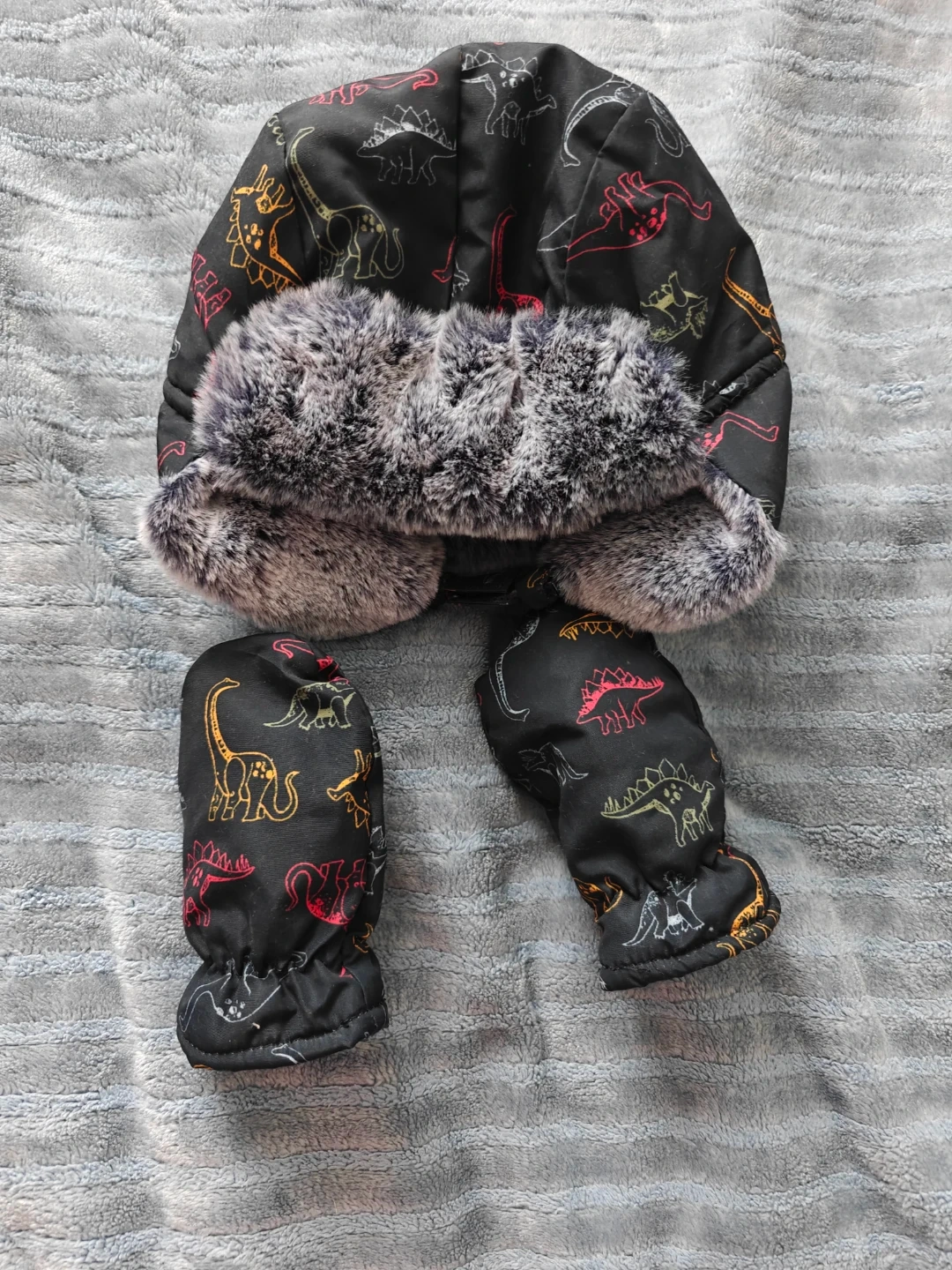 This fun set includes a black trapper hat and matching mittens, both featuring a colourful dinosaur pattern. The hat has a soft grey faux fur lining for extra warmth. Perfect for keeping little ones cosy during colder weather!