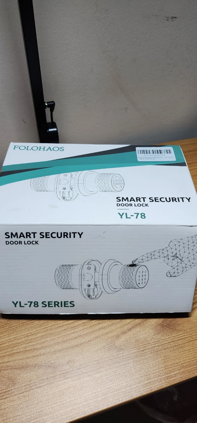 This is a FOLOHAS YL-78 series smart security door lock. It offers keyless entry and biometric fingerprint access. Included are installation instructions and mounting hardware.