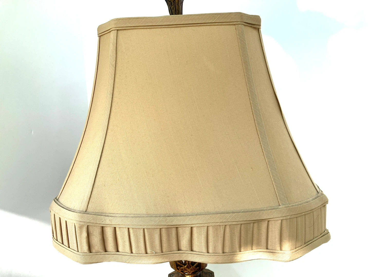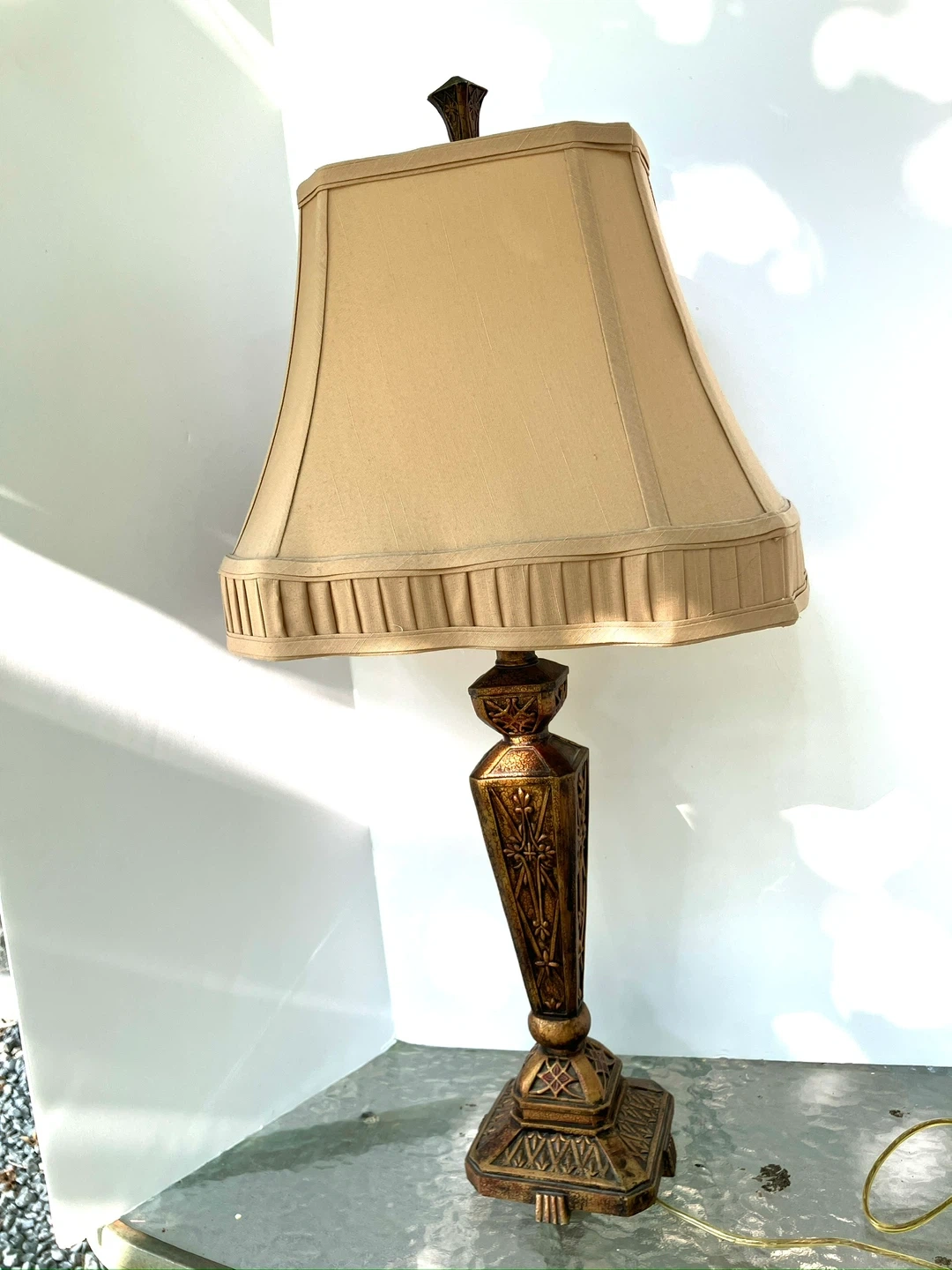 vintage table lamp features a classic design with a pleated fabric shade. Its ornate base has intricate detailing. It's a lovely accent piece for any room.