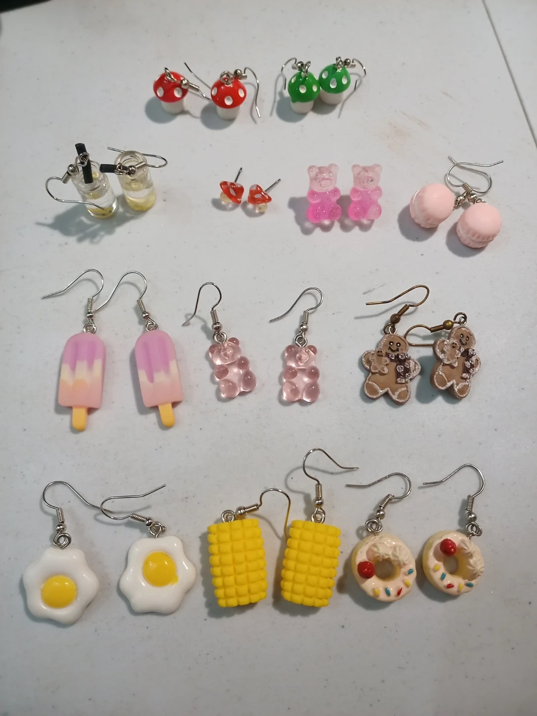 Fun and unique handmade jewelry set! Includes various novelty dangle earrings shaped like food, gummy bears, and macarons, plus a collection of beaded stretch bracelets. Great for adding a playful touch to any outfit!