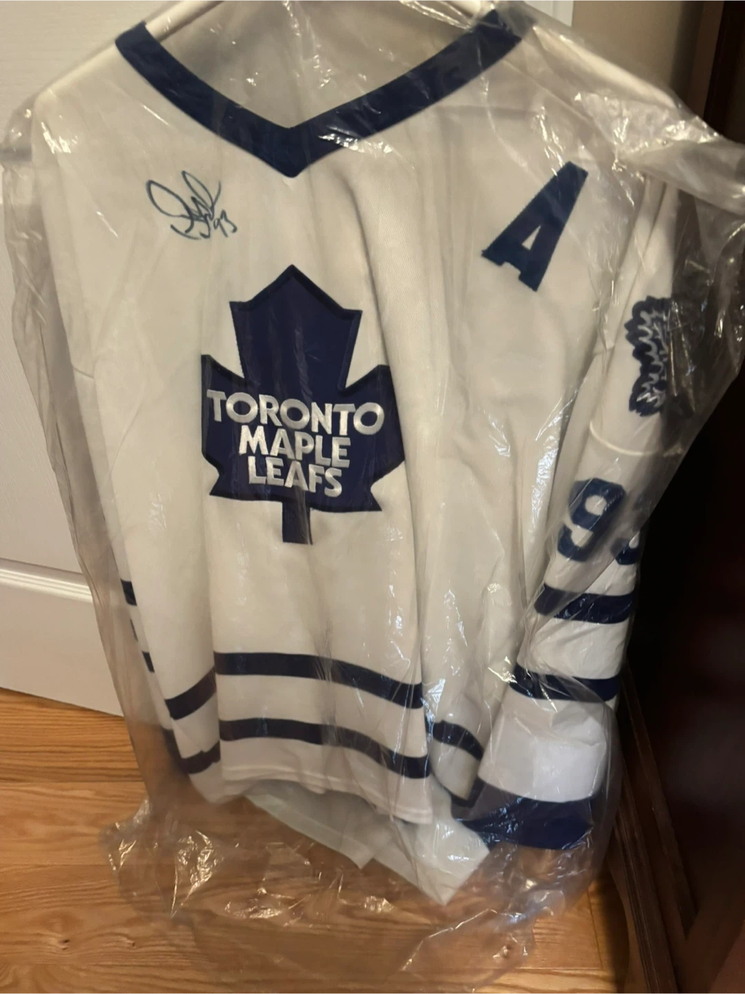 White Toronto Maple Leafs hockey jersey with blue accents and stripes. It features the team logo on the front and a signature from player "Doug Gilmour" along with the number "93". A large "4" is visible on the shoulder.