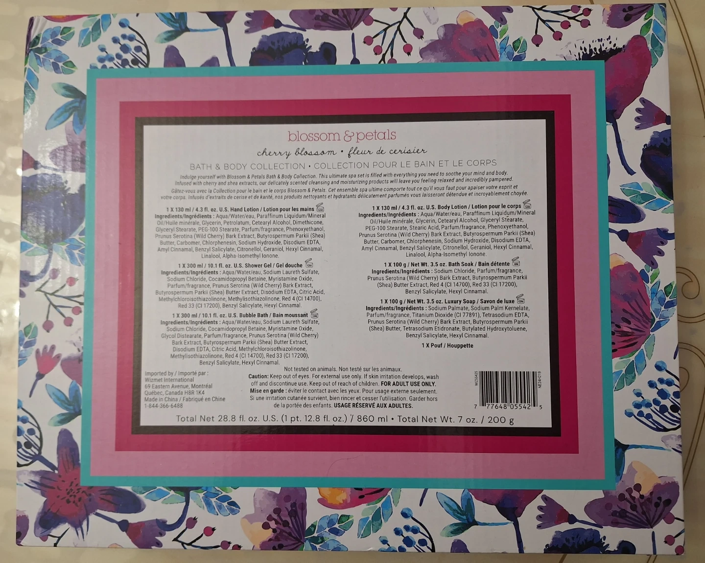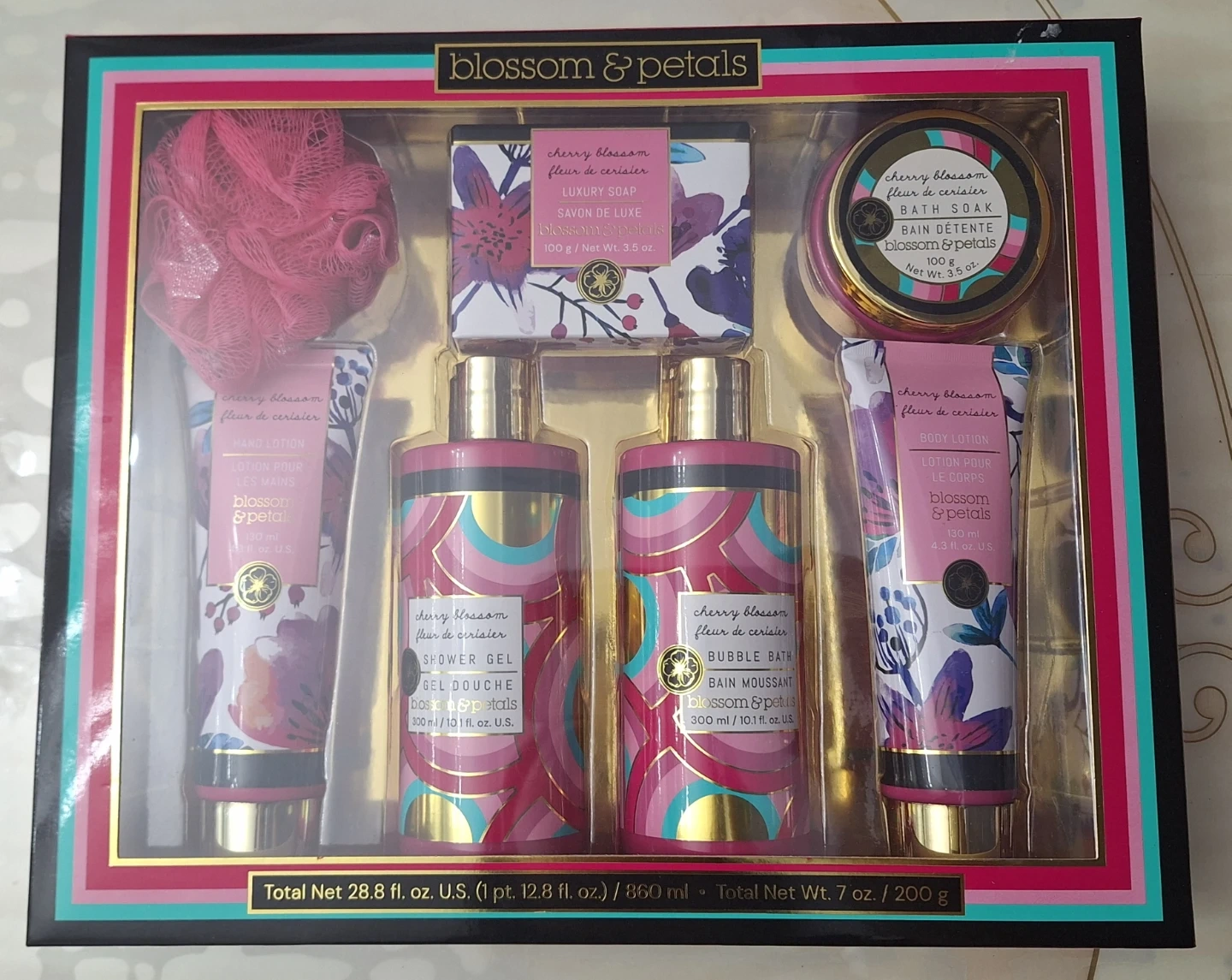 This Blossom & Petals gift set features a cherry blossom scented bath and body collection. It includes hand lotion, body lotion, shower gel, bubble bath, bath soak, and luxury soap. Everything you need for a relaxing soak and pampering session!