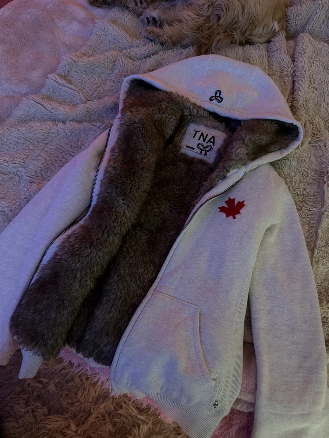 Cozy TNA hoodie in light grey with a warm faux fur lining. Features a Canadian flag patch on the back and "CANADA" text below it. Zipper closure with front pockets. Size is small
