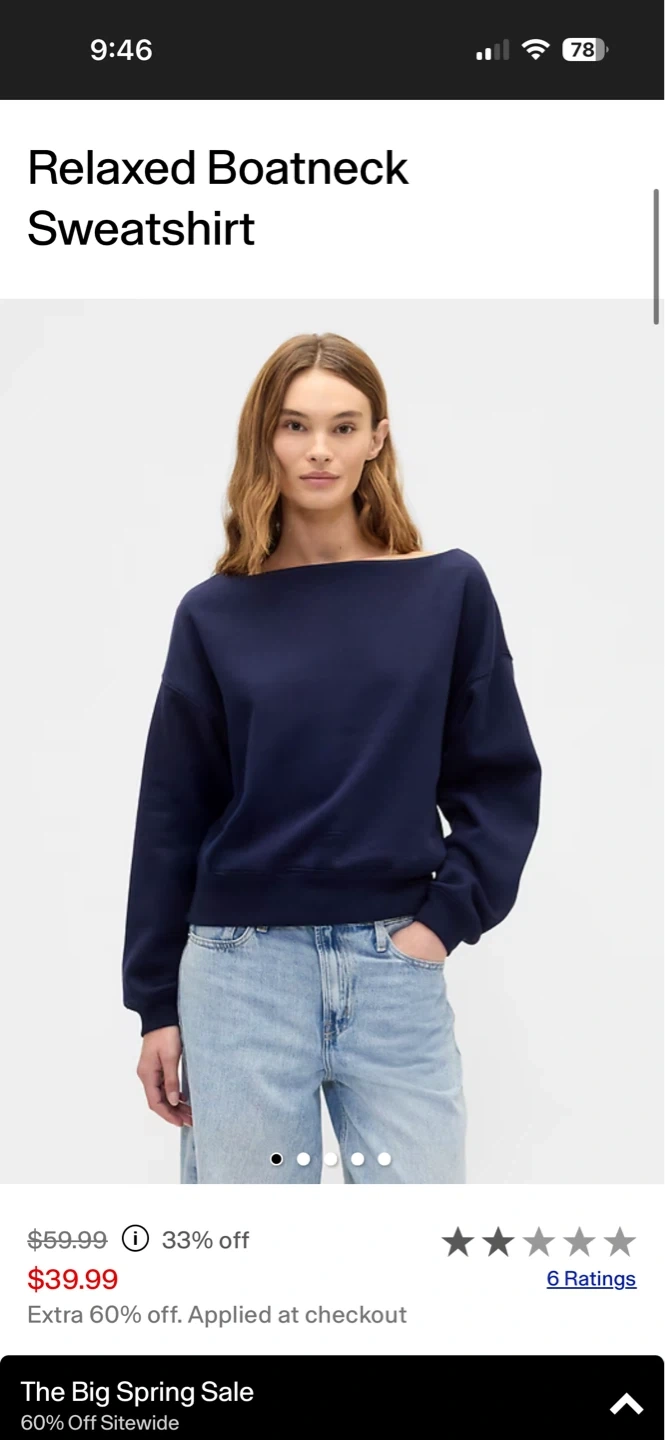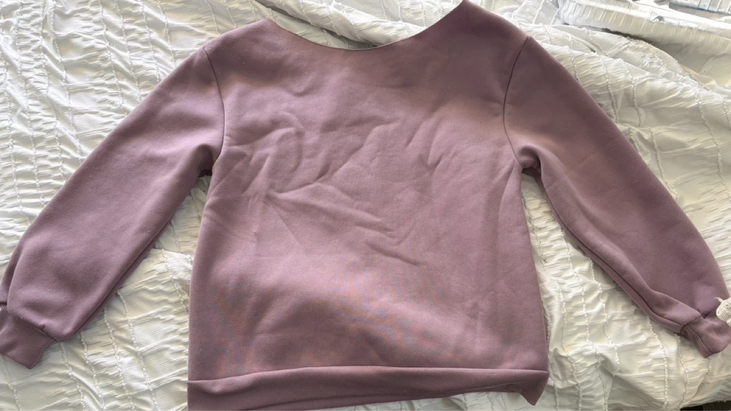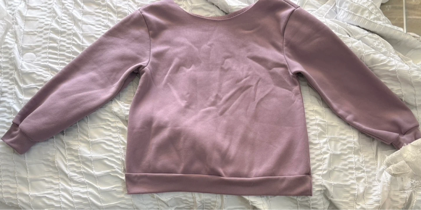 Cozy lavender sweatshirt with a relaxed boatneck design. It’s a size medium, from the Gap Factory.