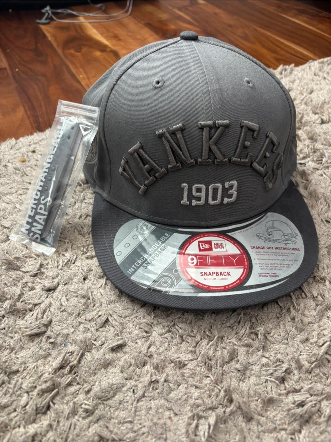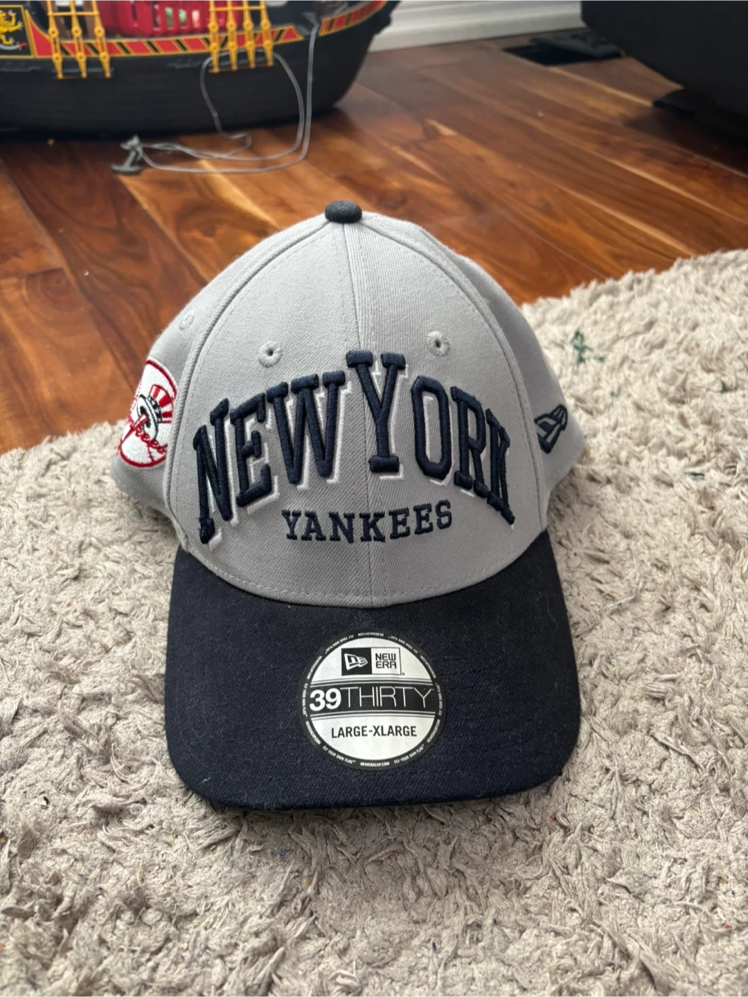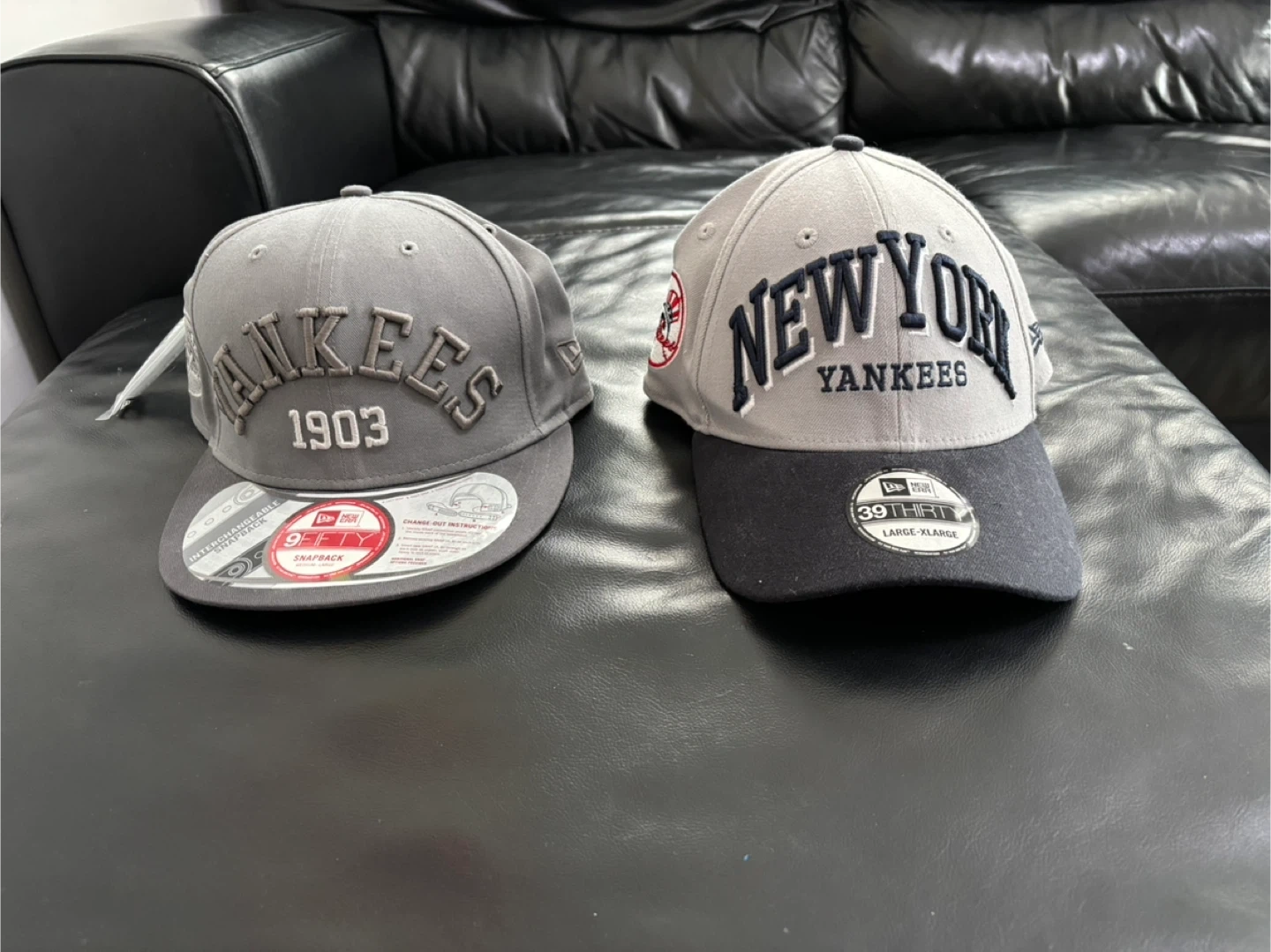 Grey and navy New York Yankees baseball cap by New Era. It's a 39THIRTY size Large-XLarge. Also includes a grey New Era 9FIFTY snapback Yankees cap with "1903" detail and interchangeable snaps.