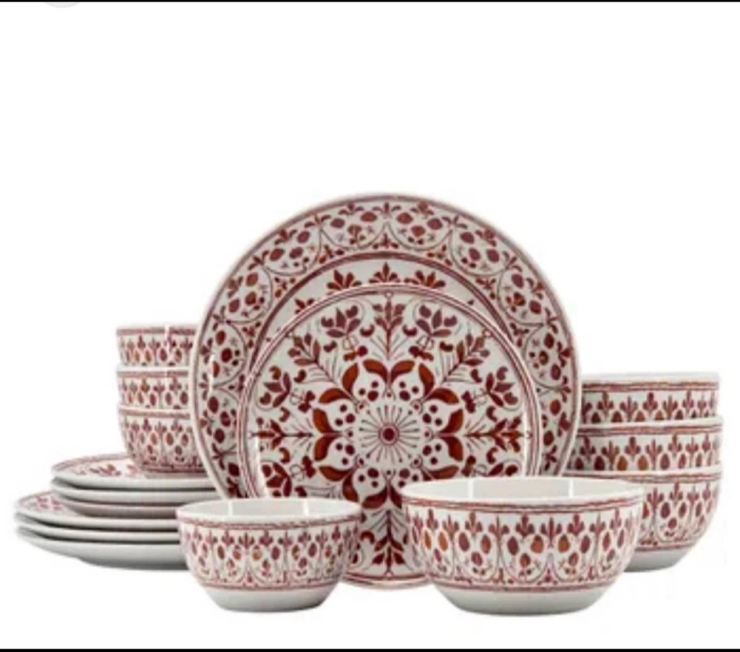 Selling a lovely dinnerware set with a beautiful red and white pattern. Perfect for adding a touch of elegance to your dining table!
