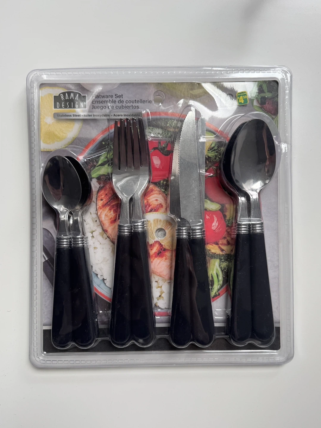 This set includes 16 pieces: 4 knives, 4 forks, 4 dinner spoons, and 4 teaspoons. Never opened.