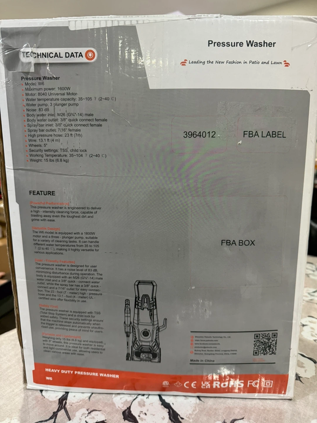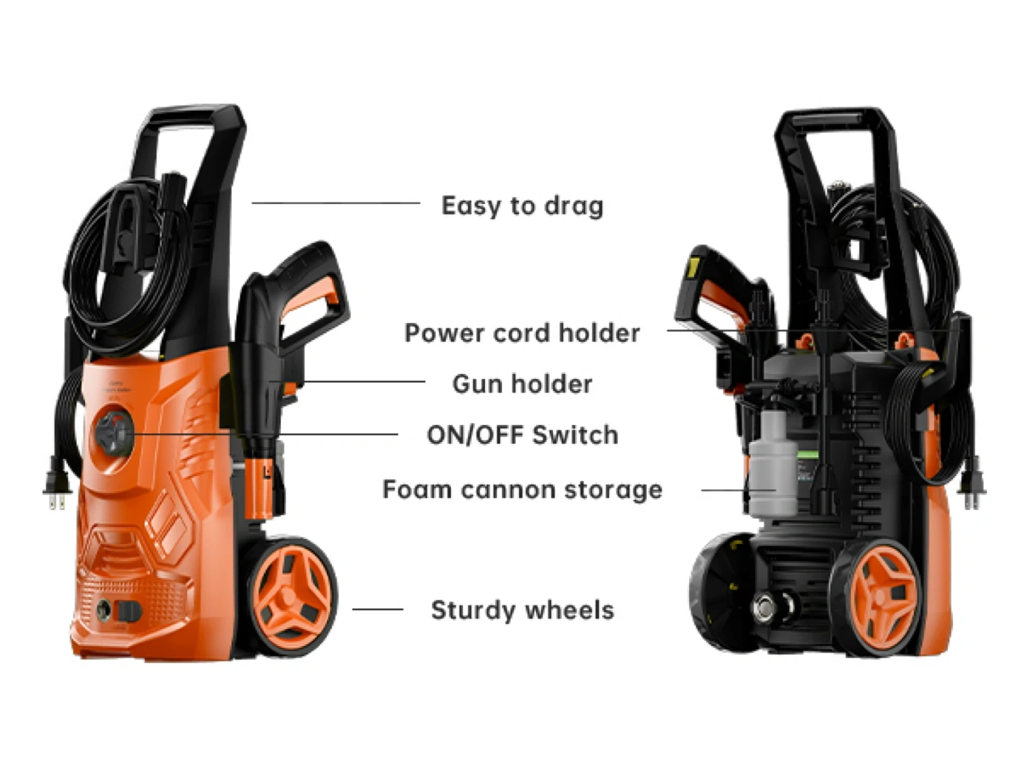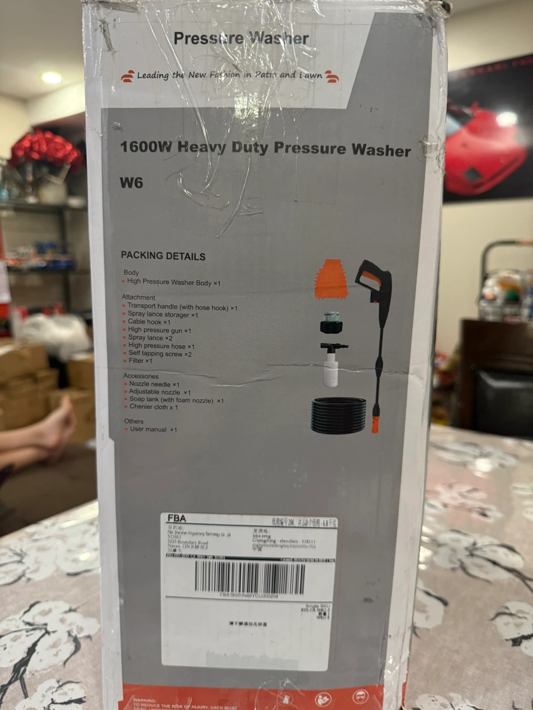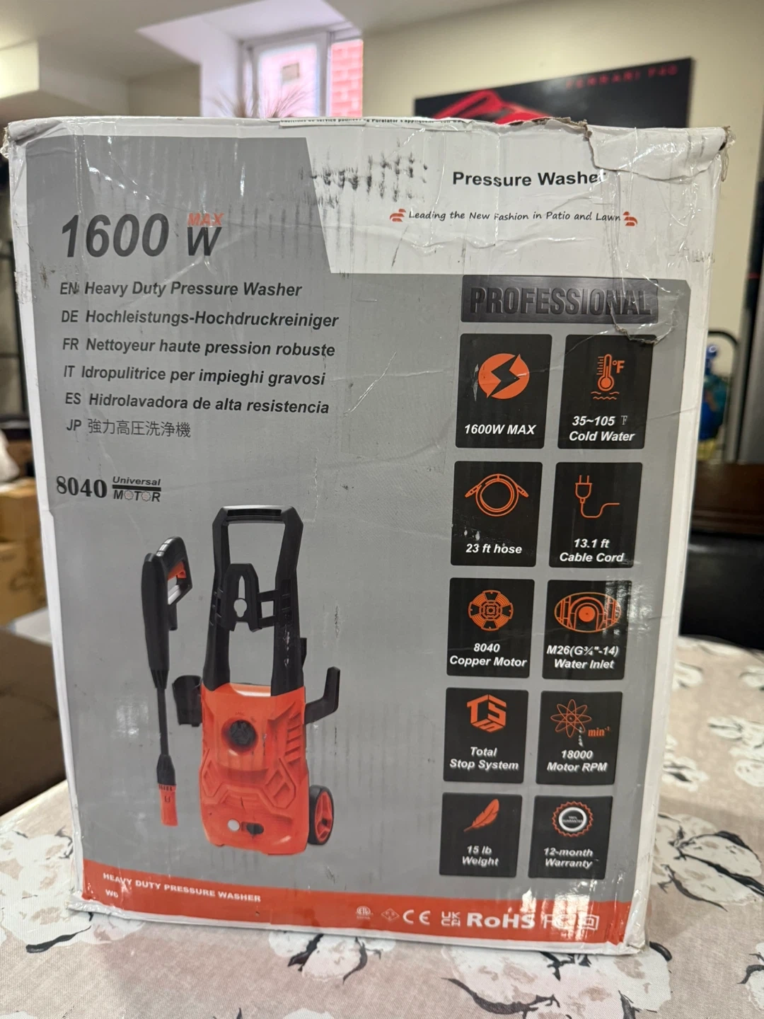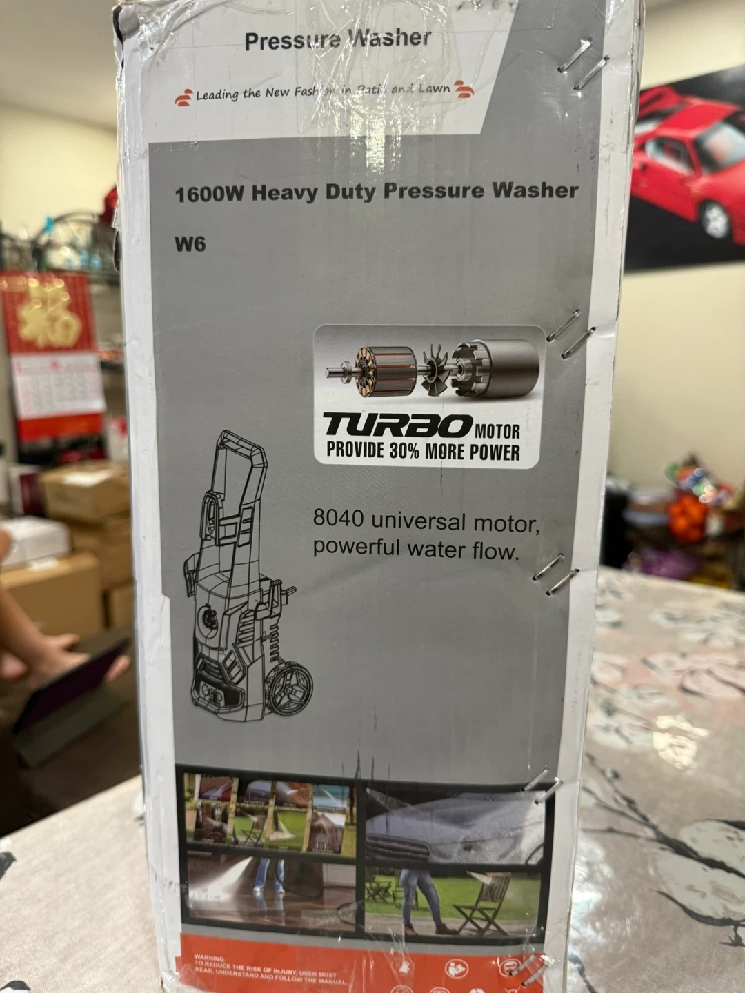 Selling a brand new 1600W Heavy Duty Pressure Washer! It comes with everything in the original box. Packing details include: - High Pressure Washer Body x1 - Transport handle (with hose hook) x1 - Spray lance storage x1 - High pressure gun x1 - High pressure hose x2 - Filter x1 - Adjustable nozzle x1 - Rotary nozzle (foam nozzle) x1 - Chenier cloth x1 - User manual x1 Features include easy to drag design, power cord holder, gun holder, on/off switch, foam cannon storage, and sturdy wheels!