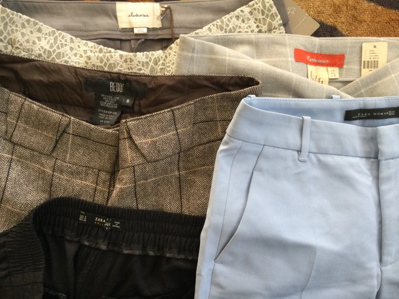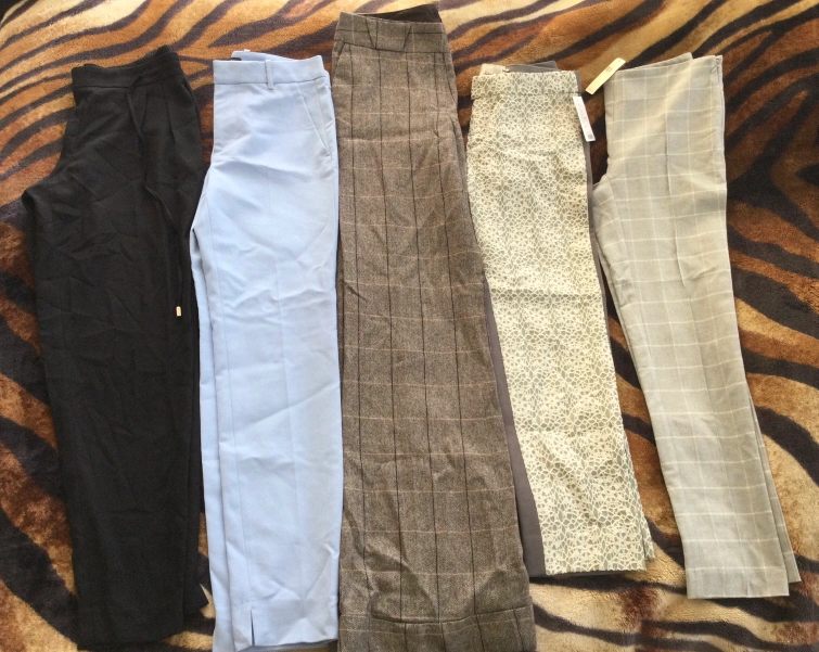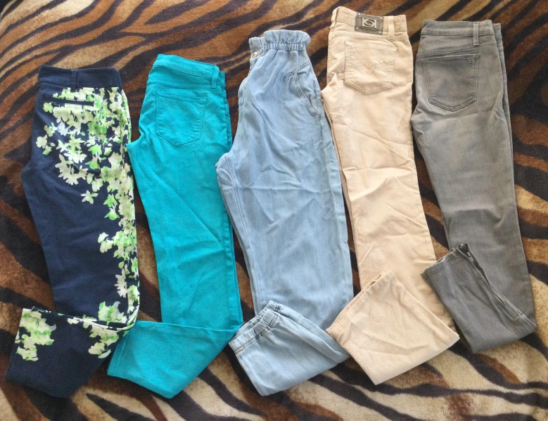Brands: Zara, Bebe, Joeโ€™s, Anthropologie. All in excellent condition. Zara blue jeans, Bebe corduroy beige jeans, Zara sky blue pants, Anthropologie grey pants are brand new.