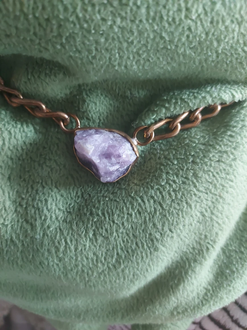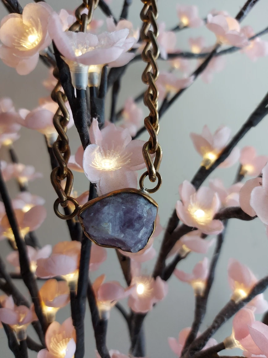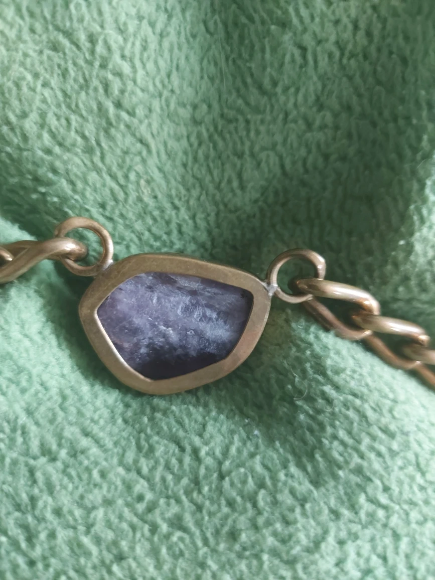 For those who like chunky jewellery!! Huge uncut amethyst set in brass and hanging from thick treated brass chain. Excellent workmanship: stone firmly set, chain solid without being too heavy. Hangs to collarbone. Two adjustment rings. Please see all photos. Available for pick-up near Oakwood Village.