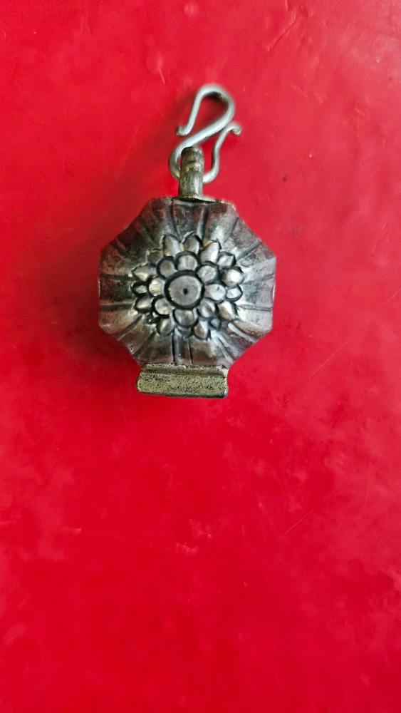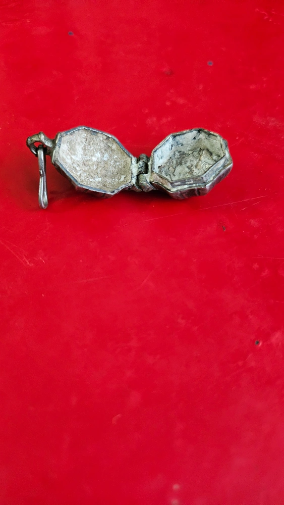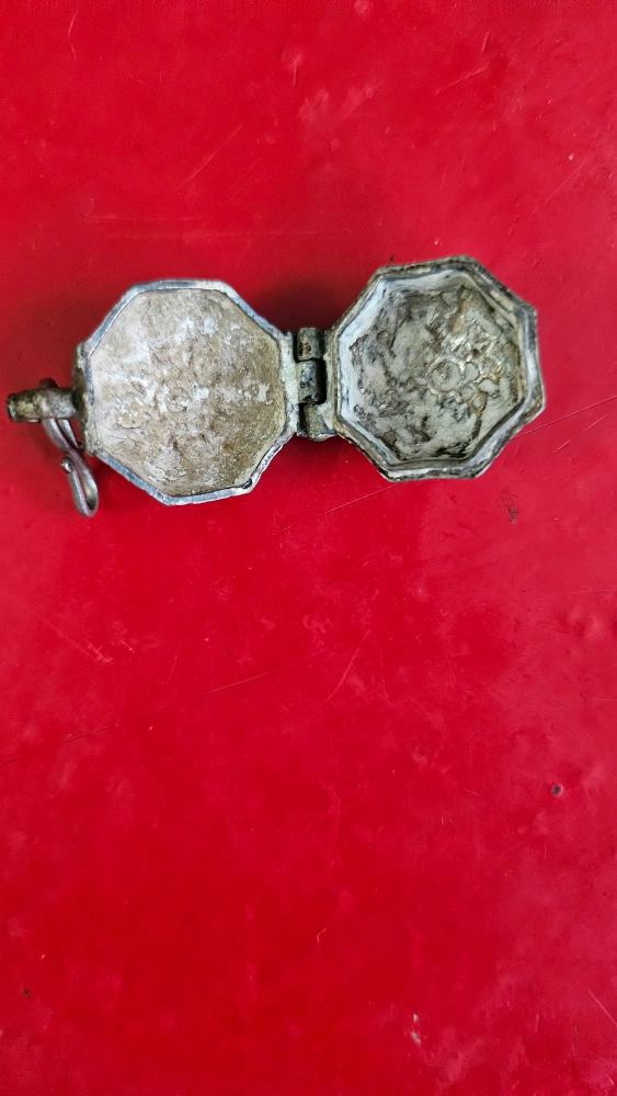 Gorgeous item, and very unique. Hinged pendant, about 2 1/2cm × 3 1/2cm. Etched floral design either side of polygonal body. Cozy space to place a folded note, some solid perfume... something else! See all photos. Available for pick-up near Oakwood Village.