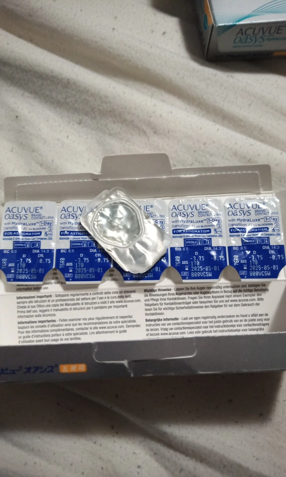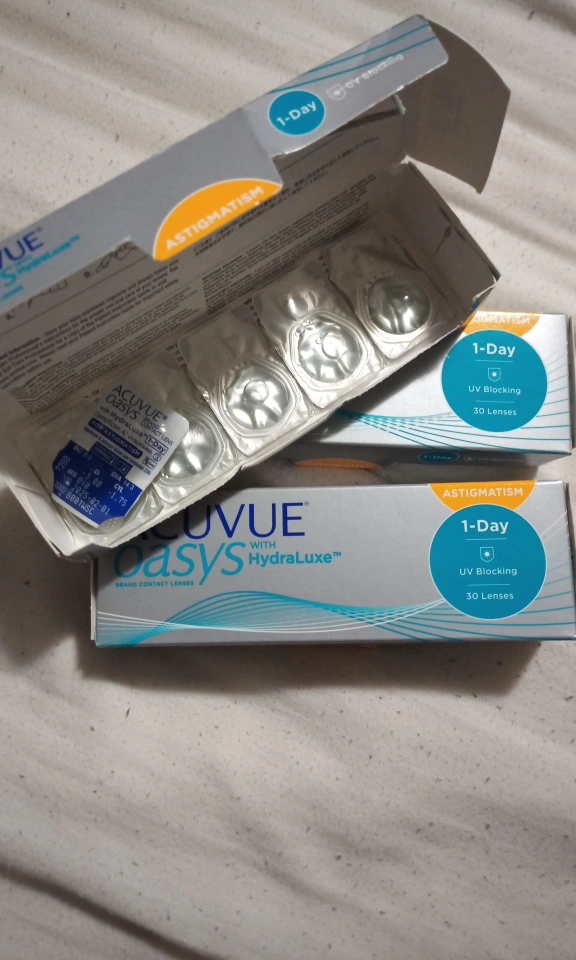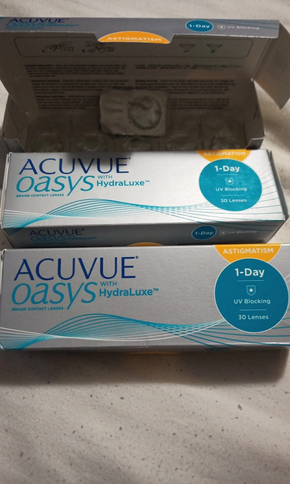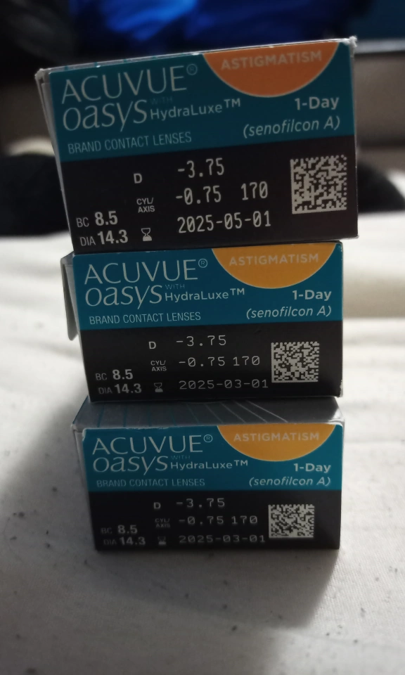 66 day (2 x 30 lenses boxes - never opened + 6 additional lenses) supply of Acuvue oasys with HydraLuxe contact lenses for astigmatism. single day wear disposable. expires May 1, 2025 prescription D -3.75 cyl/axis -0.75. 170 BC 8.5 DIA 14.3
