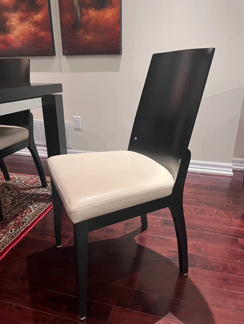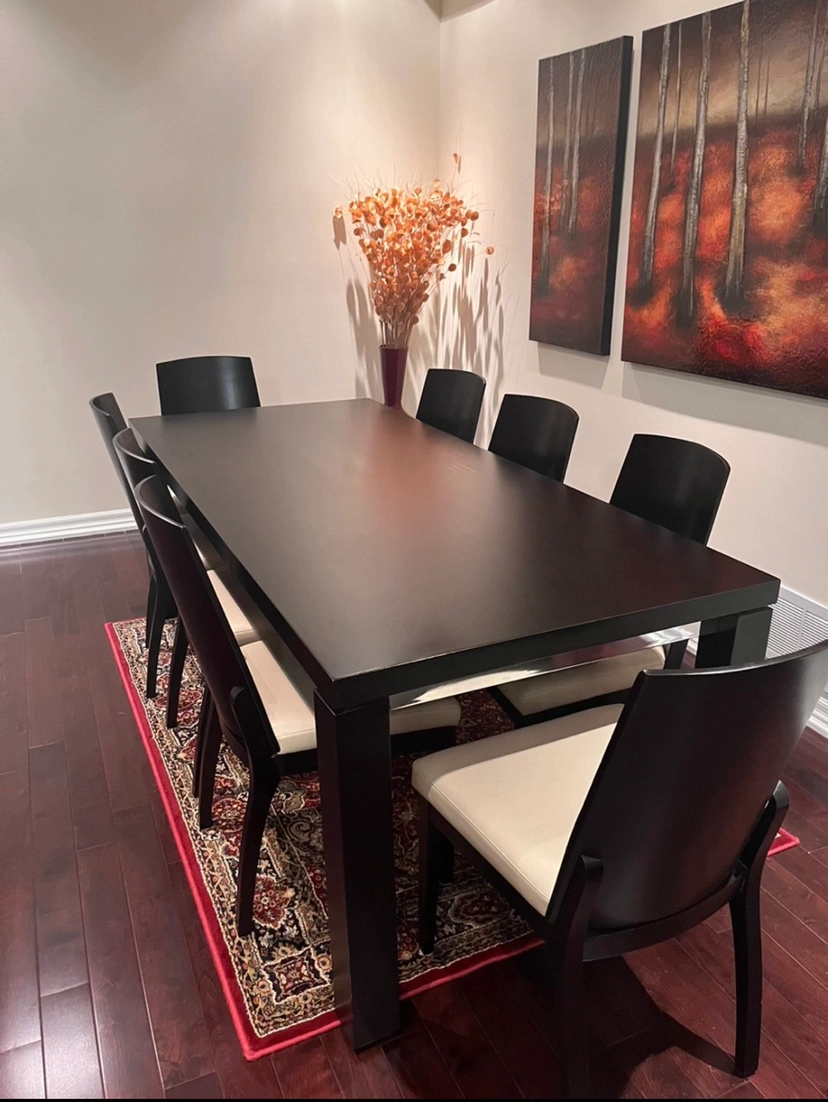 Modern Wooden Dining Table with Chairs (8) Beautiful large dining table in espresso wood. A mix of modern and traditional style. Fits 8 people comfortably. Includes 8 chairs in espresso wood with beige seats. Made in Italy Slight scratches on surface. Originally $4000 Dimensions: 79 x 35.5 x 30 inches (table) & 18 x 17 x 35.5 inches (chairs x 8) Pick up only Jefferson and Liberty. Two people needed for pick up.
