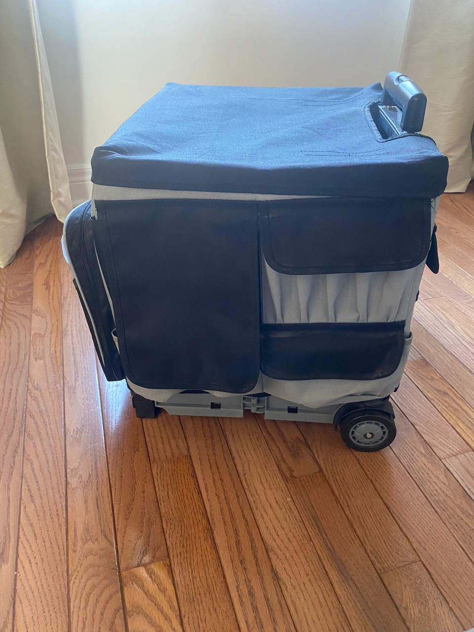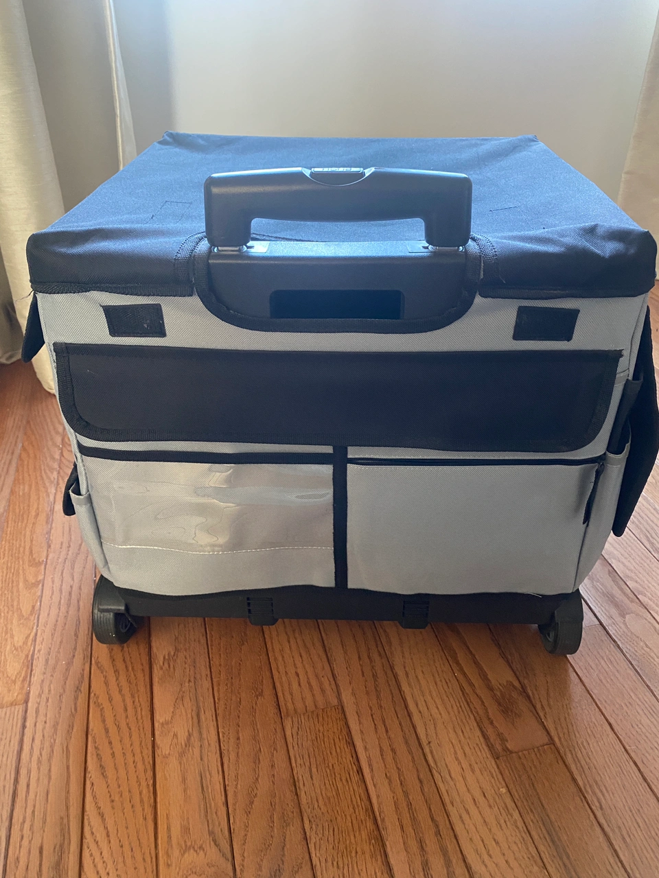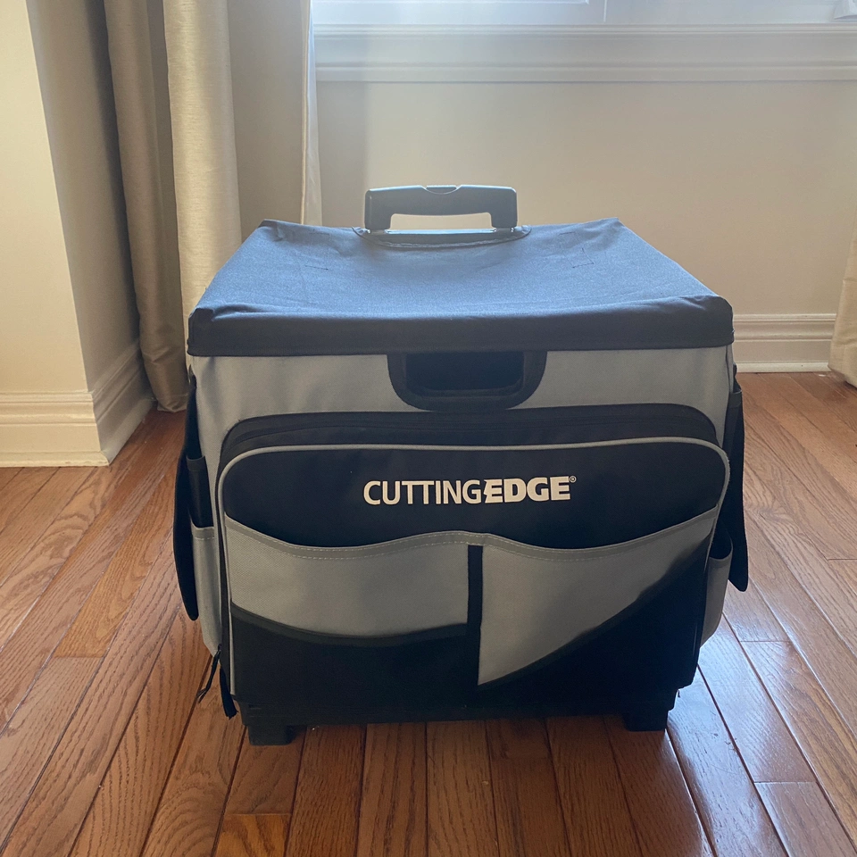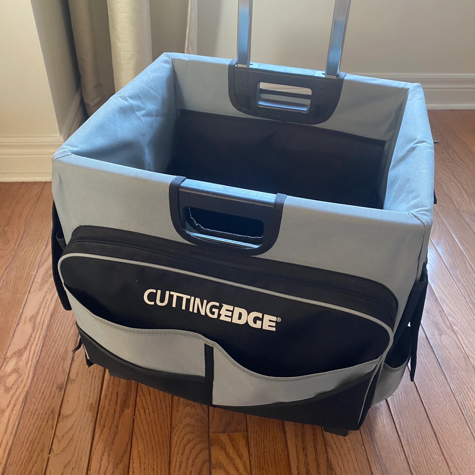 Brand: Cutting Edge -craft cart that folds down -on wheels, with extendable handle -side pockets with pouches and slots for crafting tools -easy to use tote to transport crafting supplies or other things from place to place. Perfect for portable office, tool caddy, or craft caddy. Description from manufacturer: Universal Rolling Cart holds up to 65 pounds but folds flat to only three". It has extra-wide rubber wheels for smooth rolling. The telescoping handle extends to 23" from cart and locks in three positions for easy mobility. It accommodates letter or legal size folders and binders and has over 46 storage compartments. The cart features built-in hand grips for easy moving and lifting. Double rails lock sides securely. Measures 18" by 15.50" by 16". AD In very good condition. Comes from pet free, smoke free home.