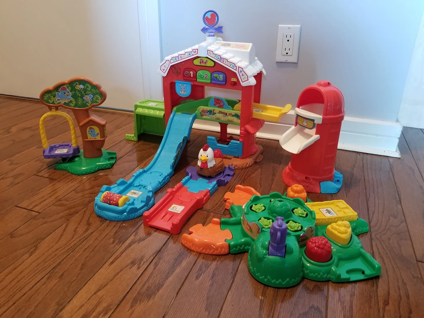 Interactive farm playset. Can be configured in multiple ways. The rooster interacts and talks when placed on different parts of the set. Some minor wear.