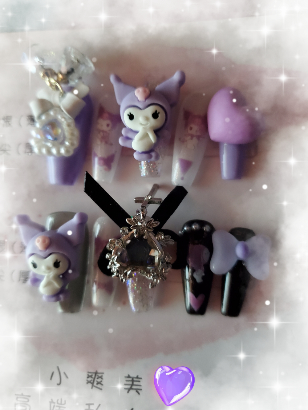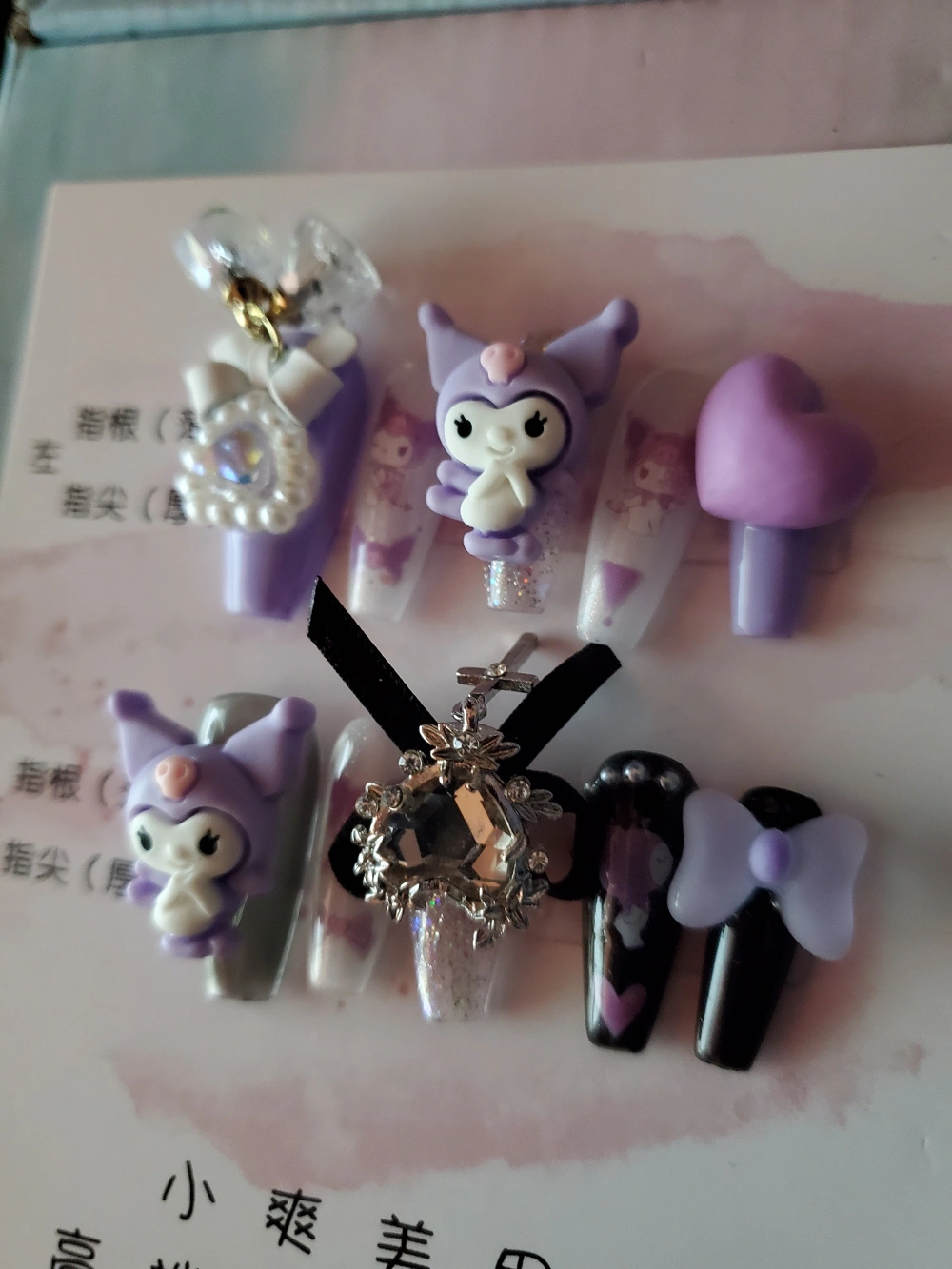 Selling cute sanrio press on nails. They are new, never glued on or worn. Size is 14mm for the thumb, 11mm index finger, 11mm middle finger, 11mm ring finger, 9mm pinky finger. Comes with glue adhesive, nail file, alcohol wipes and a small box to store the nails in.