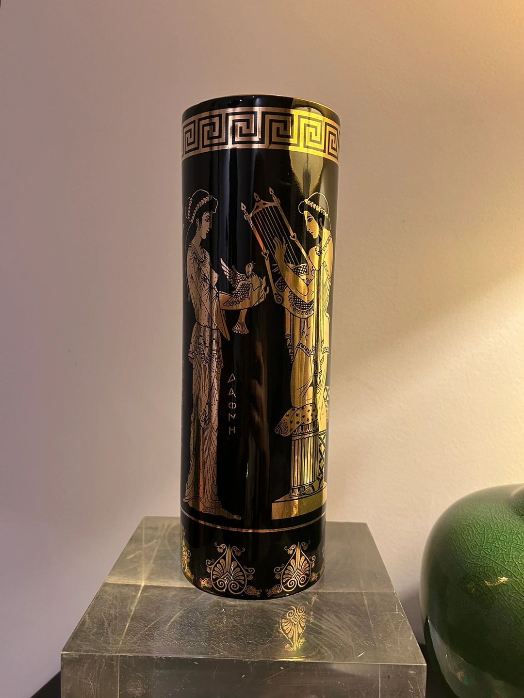 Gorgeous 24k gold hand made vintage Greek vase. 24 cm high. Family piece of high quality. It represents Daphne and Apollo, Poseidon and Athena, with their names written in Greek.