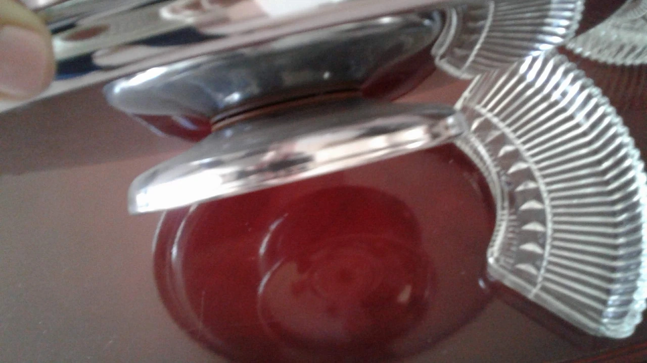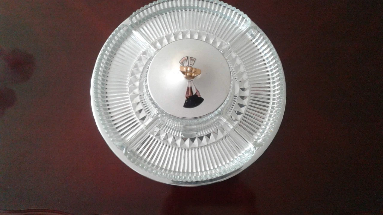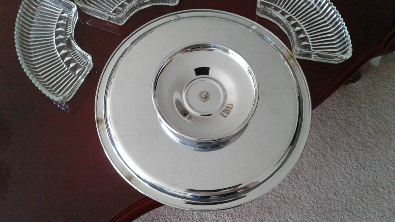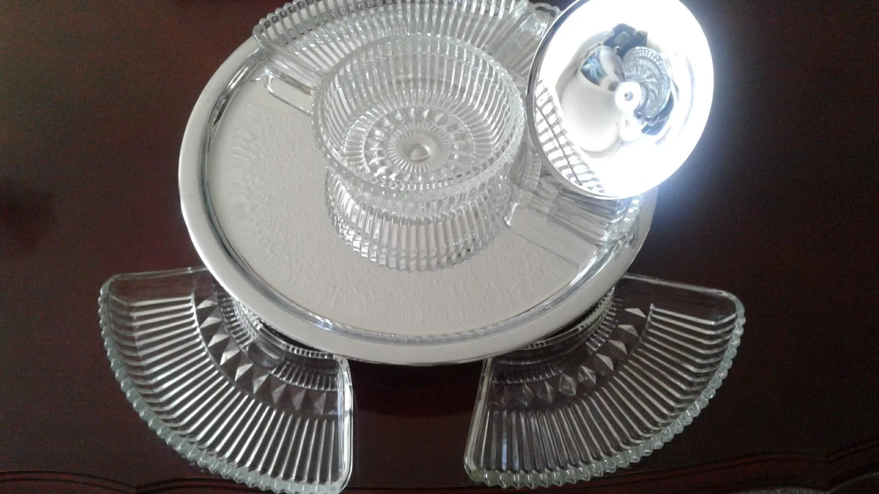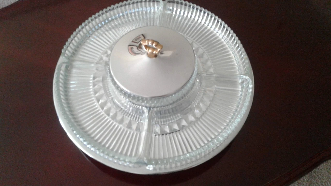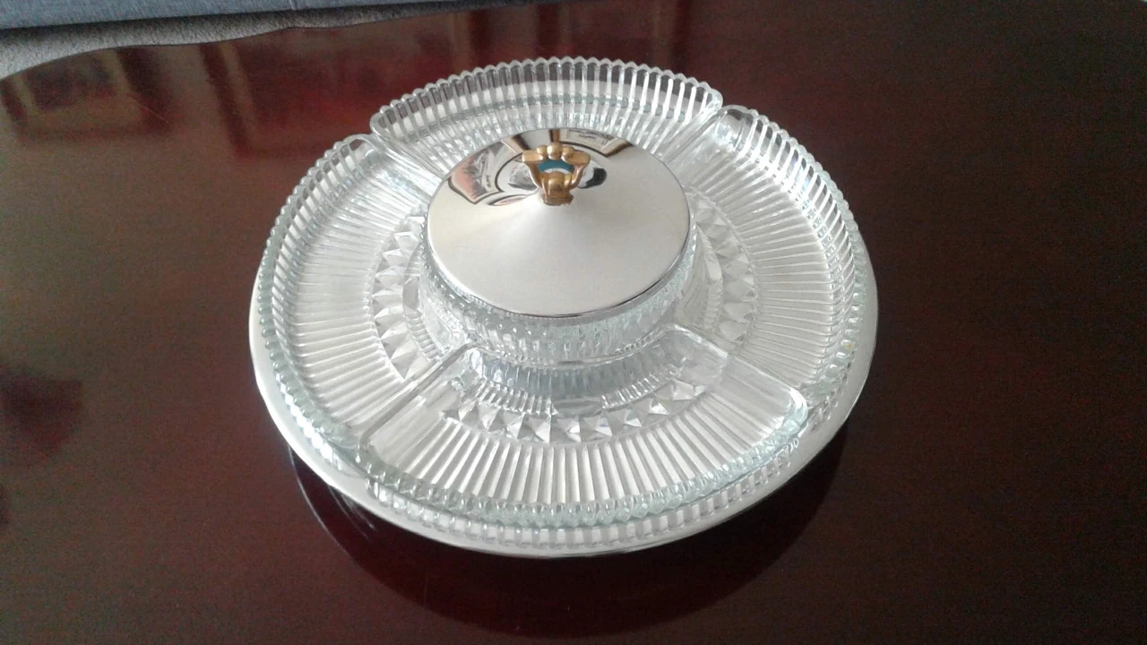 The set has 4 side plates, 1 center bowl with the lid silver with gold handle.