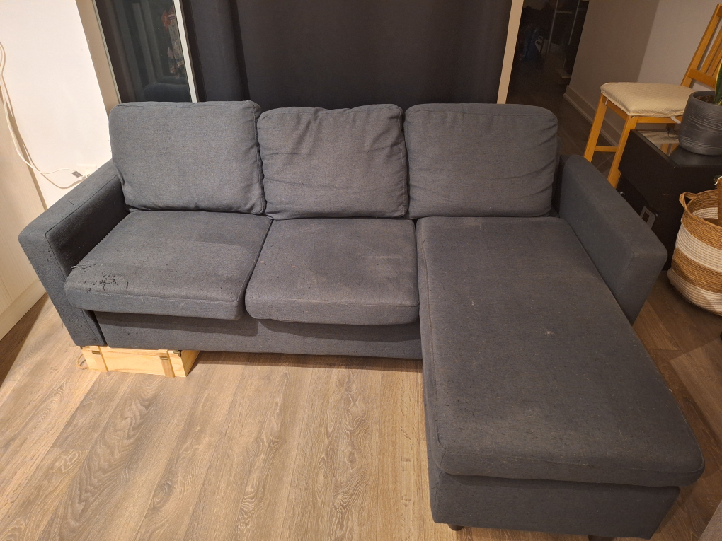 Giving away this couch. One of the legs is a bit broken, but the wooden box (shown in the picture) holds it perfectly.183 cm long x 73 cm width. The extension can be changed to the other side. Very light to carry. If it could be of use to you, it’s yours. Pickup near Bay and Wellesley.