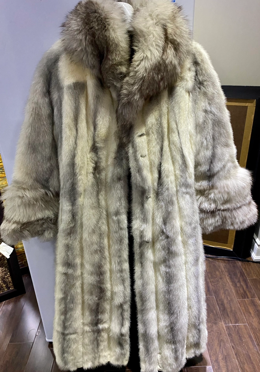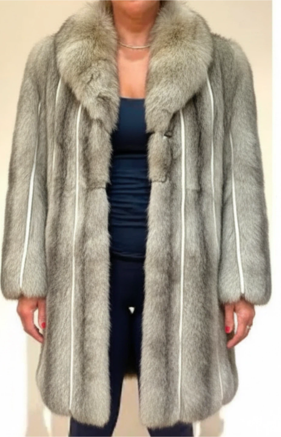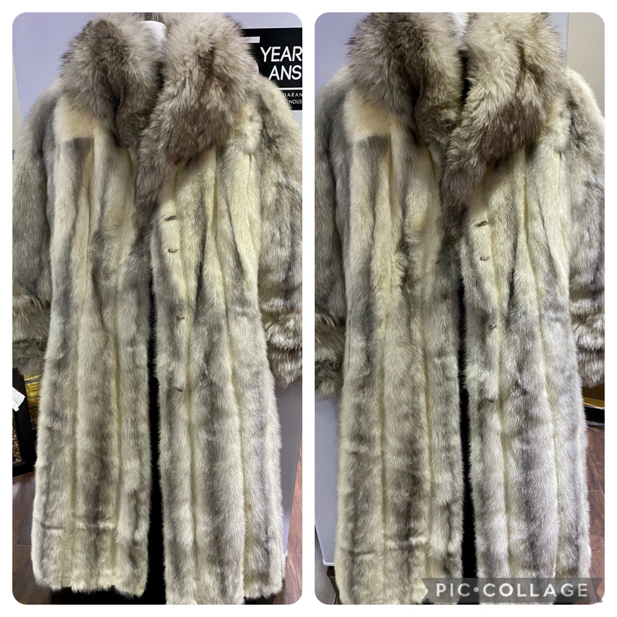 Beautiful mink coat with real fox fur collar! White leather strips between panels of mink and leather side panels. Single Hook and loop closure.