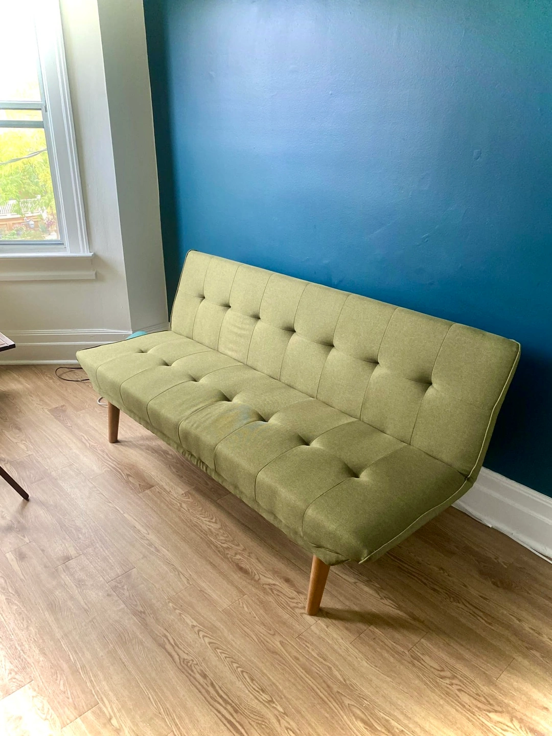 - Like-new moss green click-clack sofa, perfect for modern or contemporary interiors