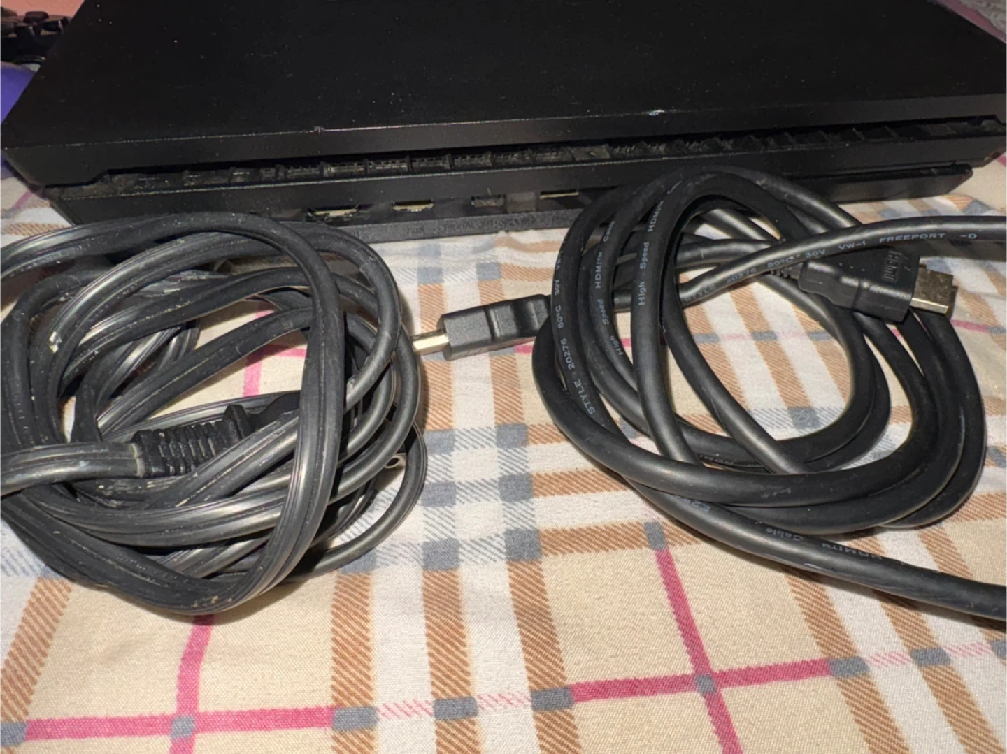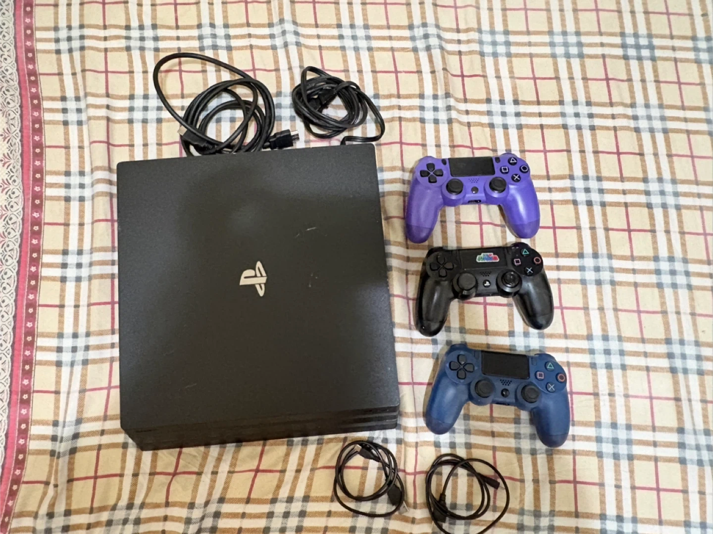 This is a Sony PlayStation 4 Pro 1TB console. It comes with three DualShock 4 controllers in blue, black, and purple. Includes power and HDMI cables.