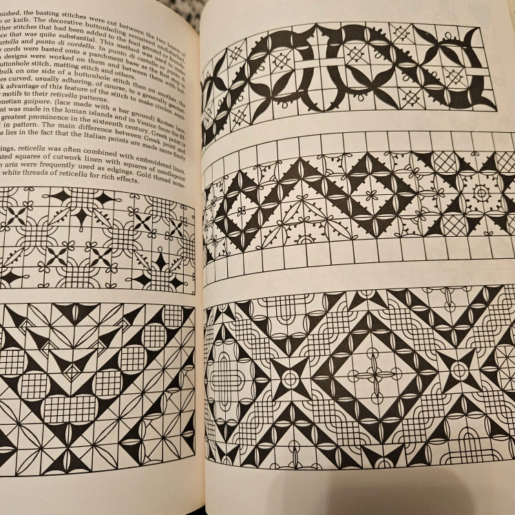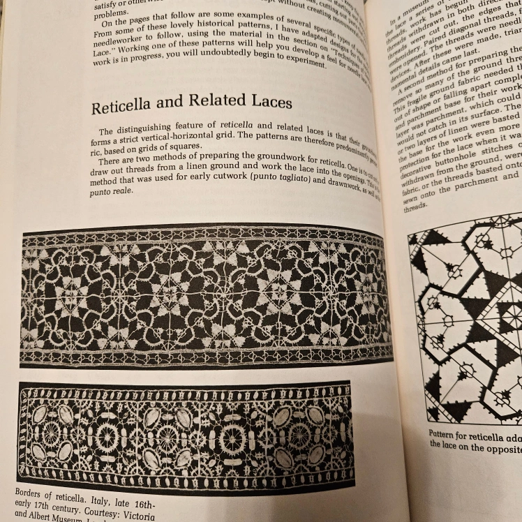 Unique Book History and Techniques of making Lace, embroidery, gabilens tapestry. Many patterns and designs.