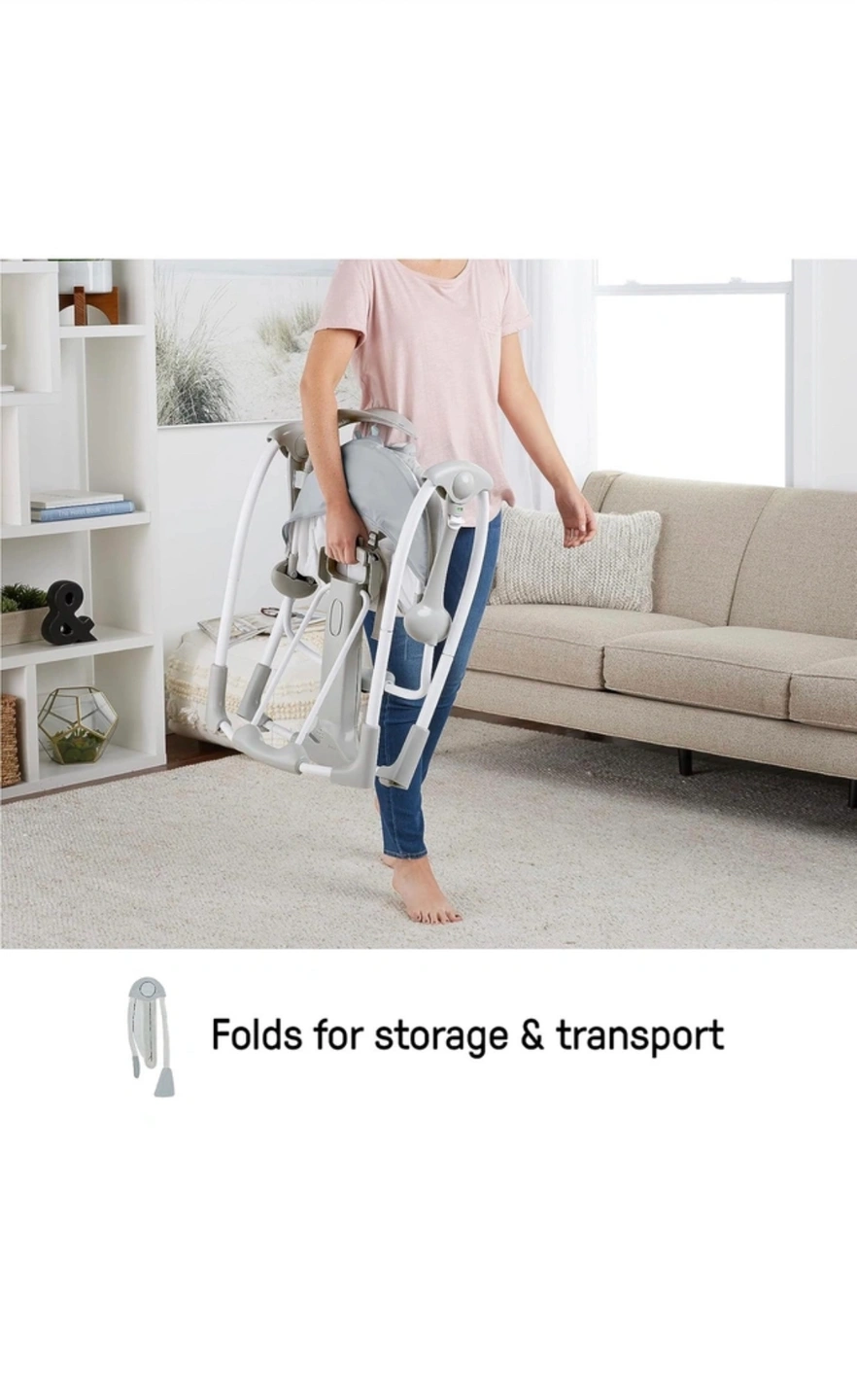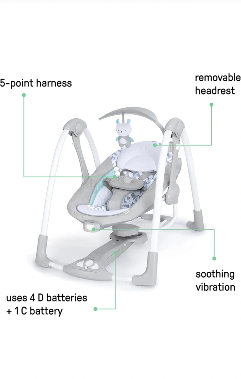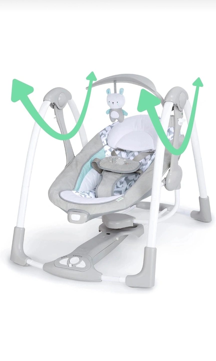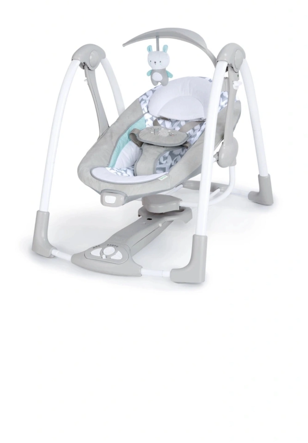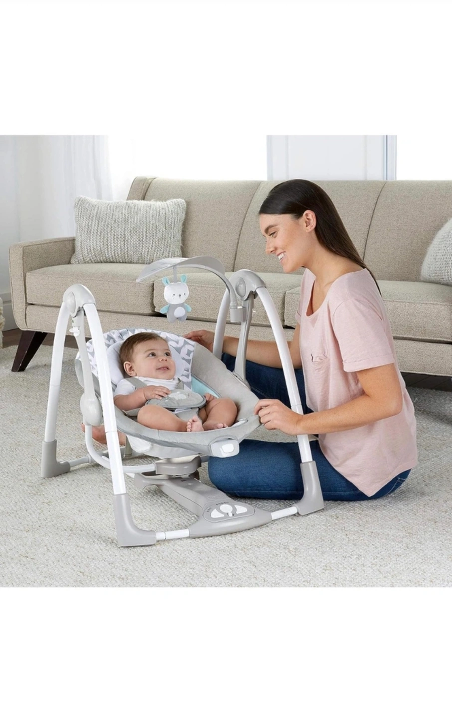 Your newborn can swing or sit in comfort with the ConvertMe Swing-2-Seat from Ingenuity while you get a few hands-free minutes back in your day. When your infant wants to sway, the automatic swing setting will calm and comfort. Convert it into a stationary vibrating seat with our secure EasyLock system. This travel friendly baby swing features a foldable design so it can lay flat for easy storage and portability. Soothe your little one with 12 melodies and 4 nature sounds, or keep him entertained with the pivoting toy bar. The plush seat pad and removable head rest are easy to clean. Wherever you need to go, this