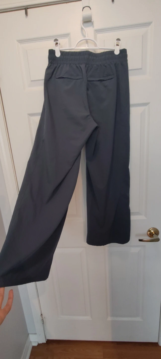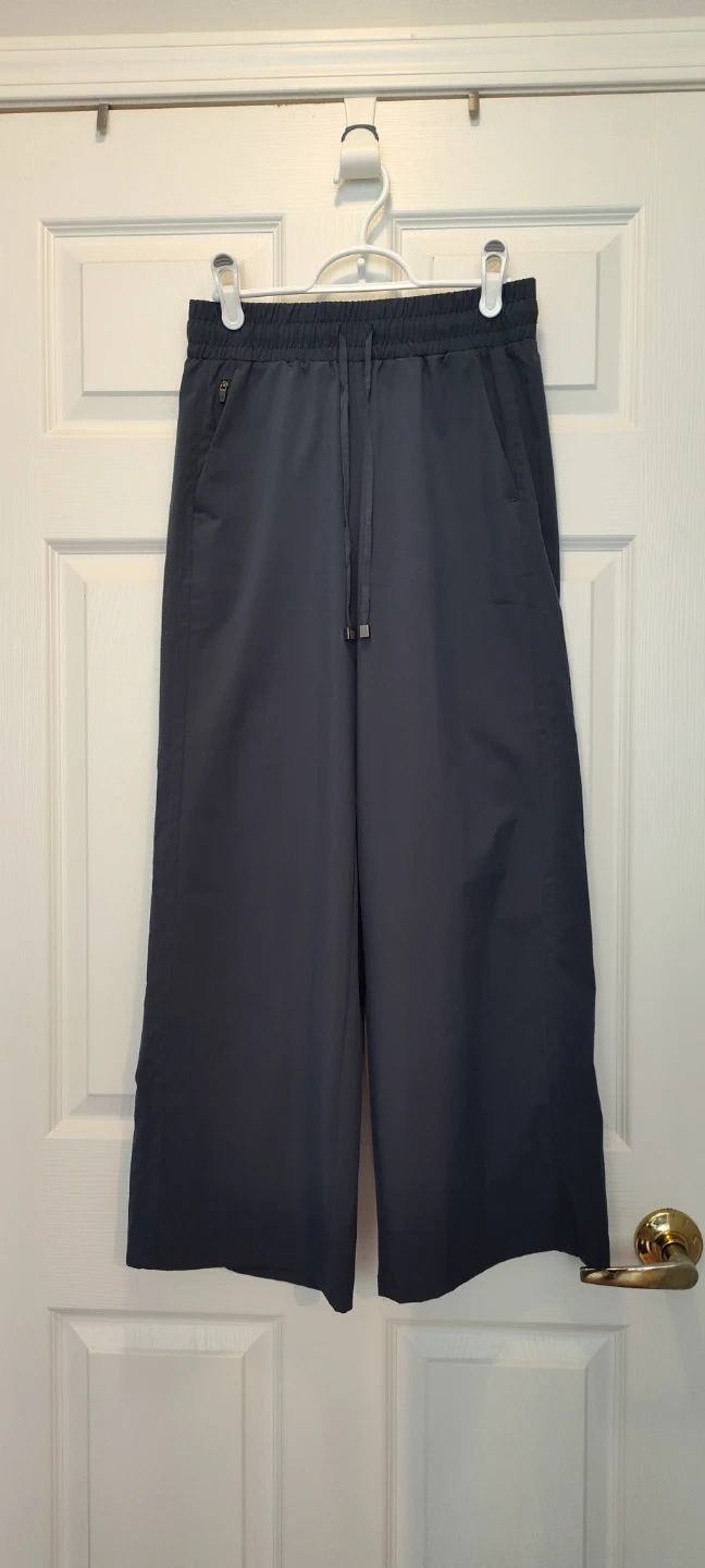 These wide-leg crop pants are in a classic dark blue colour. They're made from a soft, stretchy fabric for ultimate comfort. The high-rise waist and cropped length make them a versatile addition to your wardrobe.