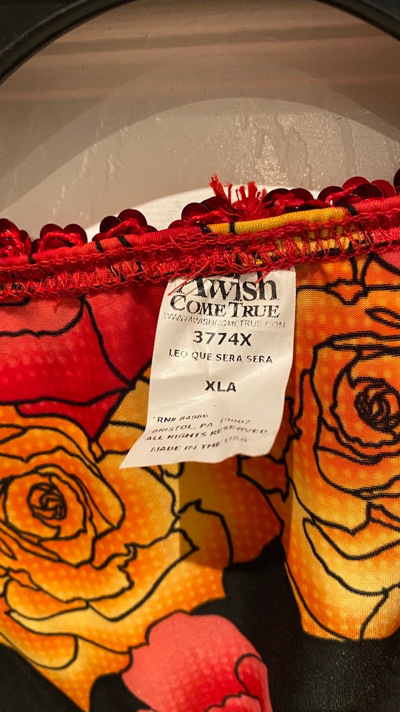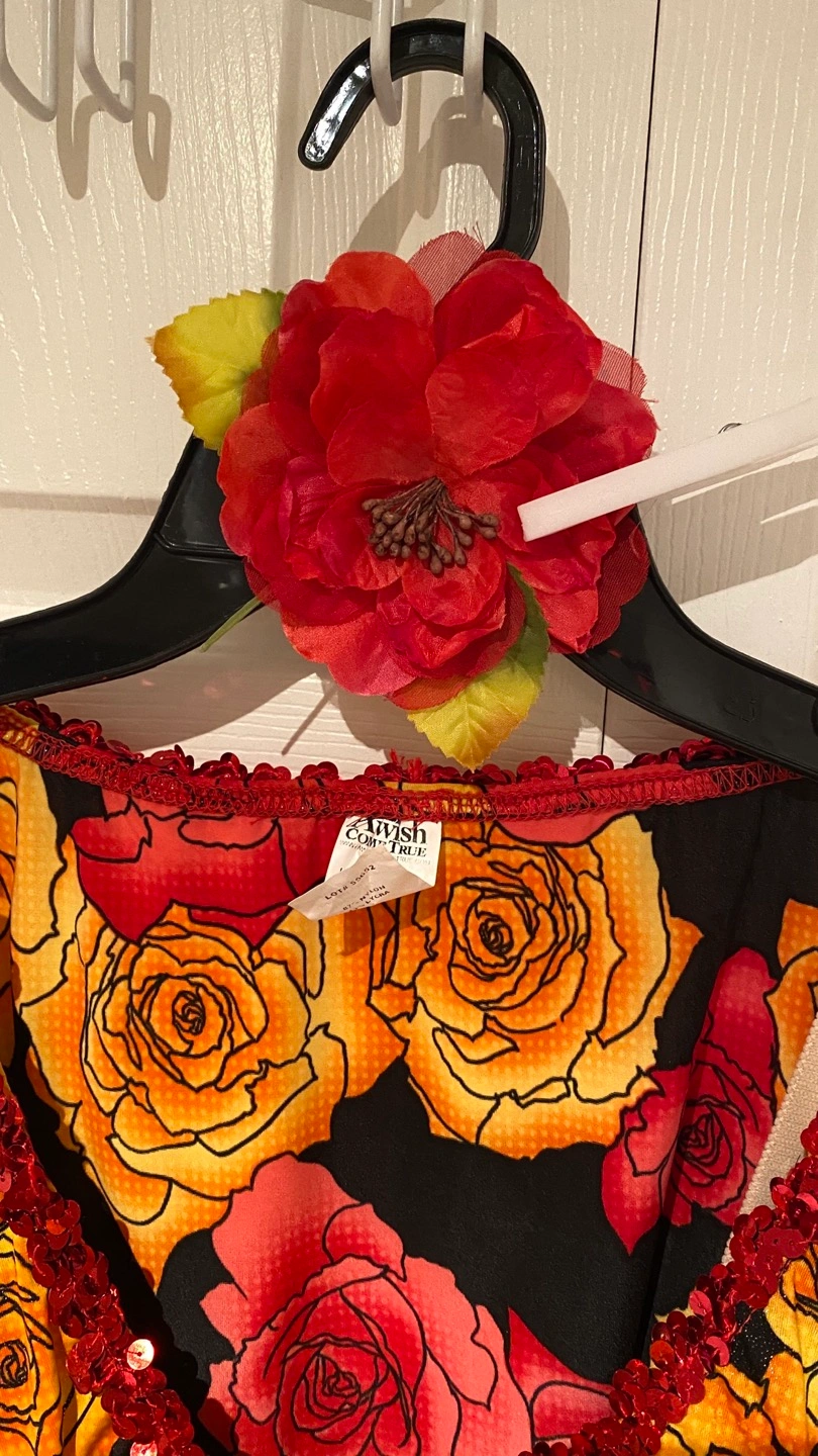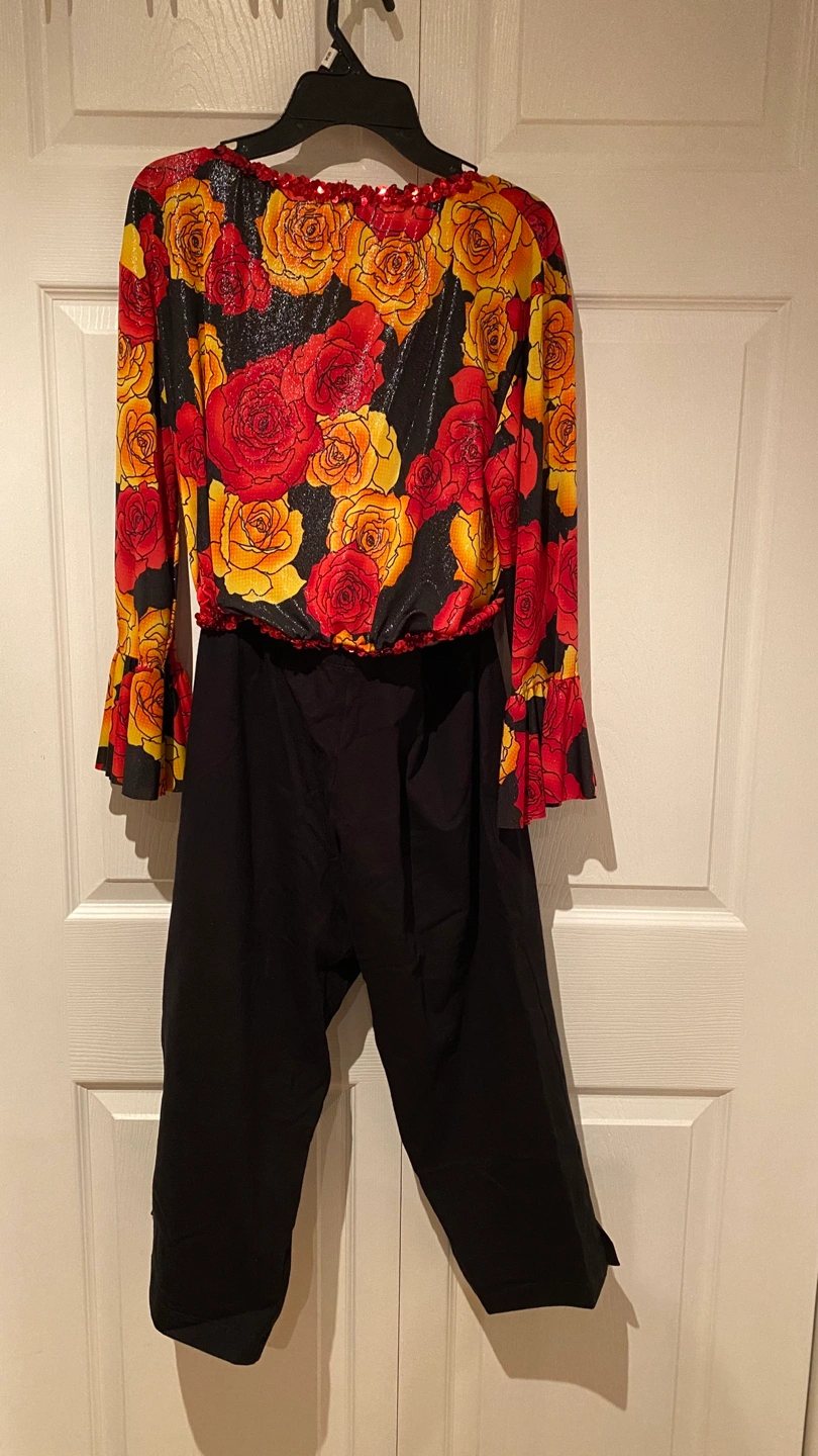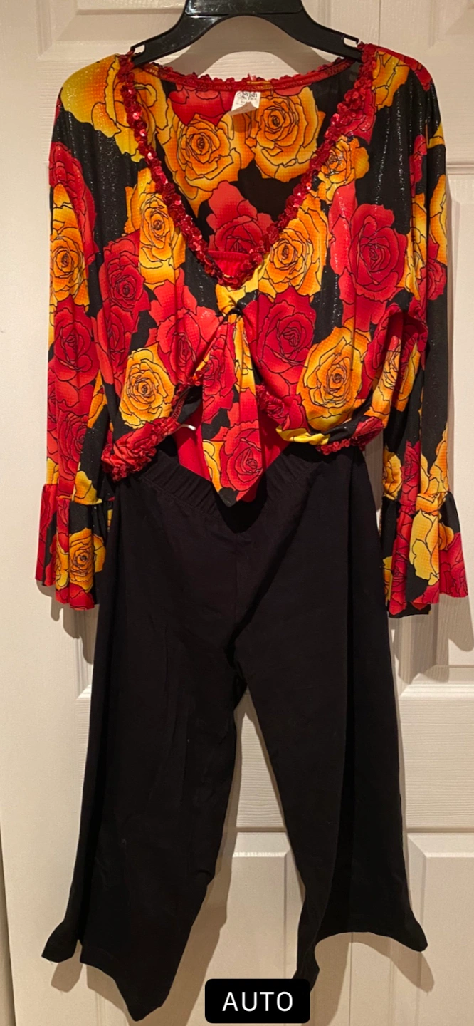 A Wish Come True - red body suit, floral bolero top with bell sleeves, black Capri pants, hair accessory. Excellent condition. Two flaws - one on bodice of body suit which cannot be seen when bolero is on top and on Capri (last two pictures).
