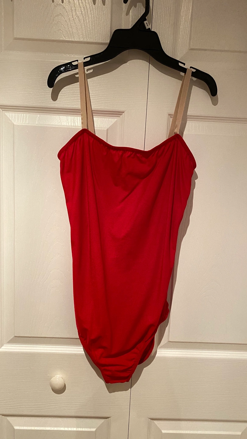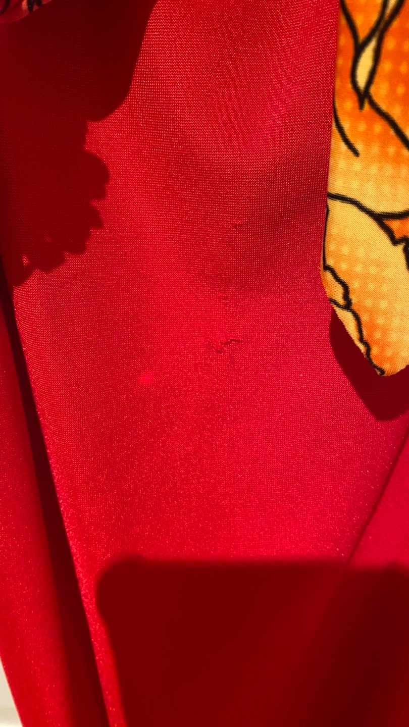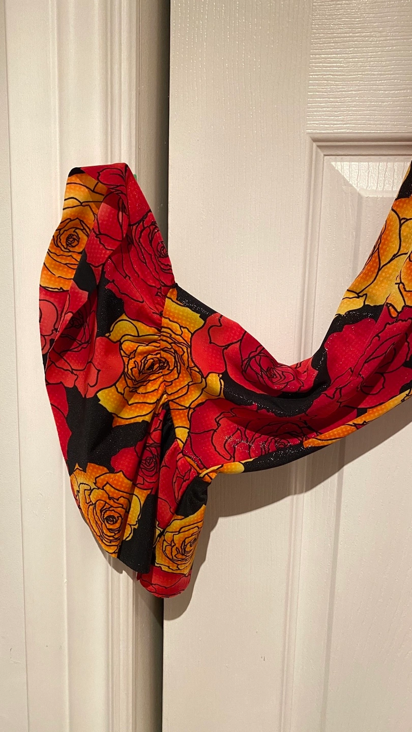 A Wish Come True - red body suit, floral bolero top with bell sleeves, black Capri pants, hair accessory. Excellent condition. Two flaws - one on bodice of body suit which cannot be seen when bolero is on top and on Capri (last two pictures).