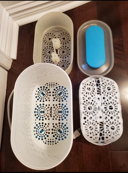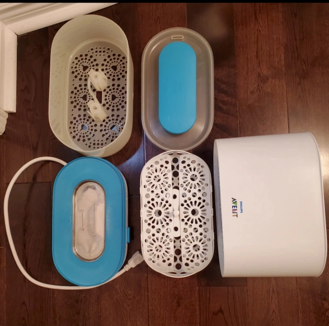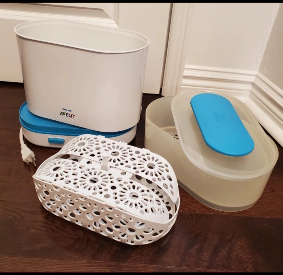 Electric Philips Avent bottle steam sterilizer, includes dishwasher basket to hold bottles rings and nipples.