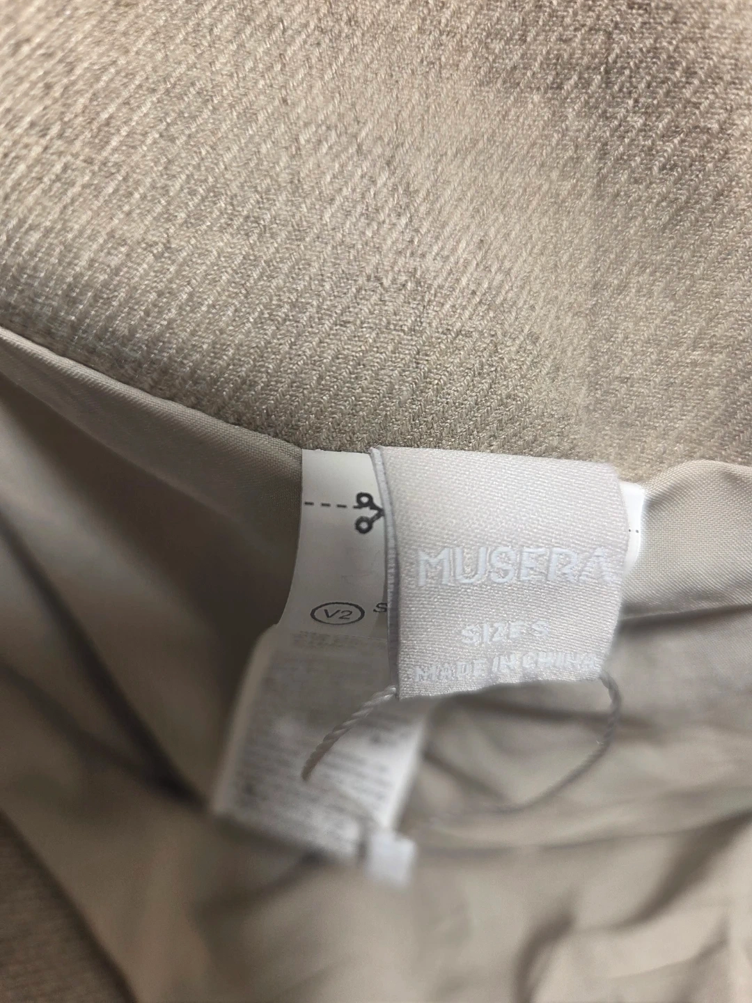 This is a beige Musea corset dress. It's made from a linen blend with 80% polyester and 17% viscose. The lining is 100% polyester. This dress is perfect for a summer outing!
