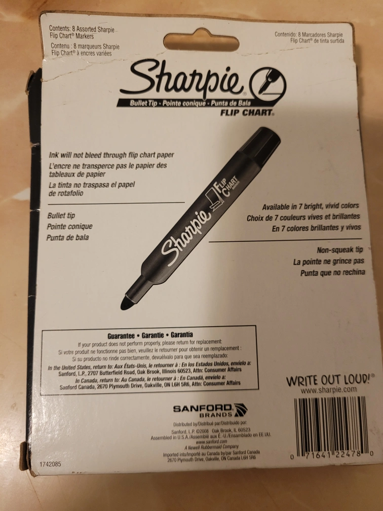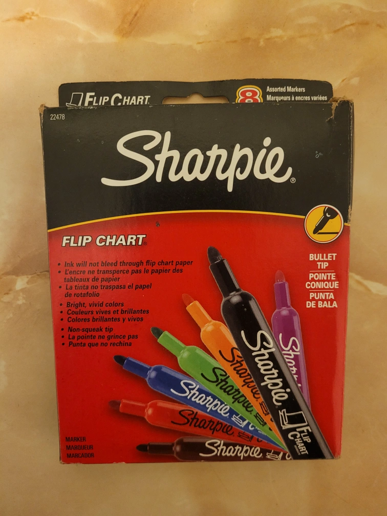Flip Chart 8 SHARPIE Bullet tip colorđź–Ť assorted markers. 1 Red, 1 Blue, 1 Green, 1 Orange, 1 Purple, 1 Brown, 2 Black