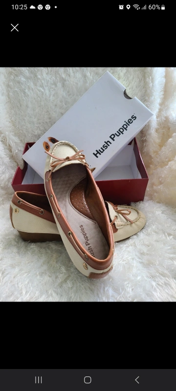 Hush Puppies, Color- off white & brown , soft leather. They are in very good condition. Pick up from Parkwoods North York area.