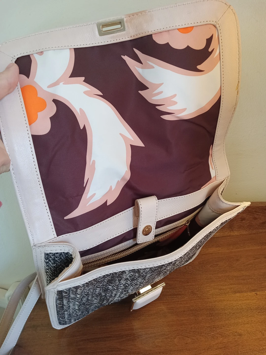 The interior fabric graphic design is beautiful chocolate brown, white, blush pink and a hit of orange.